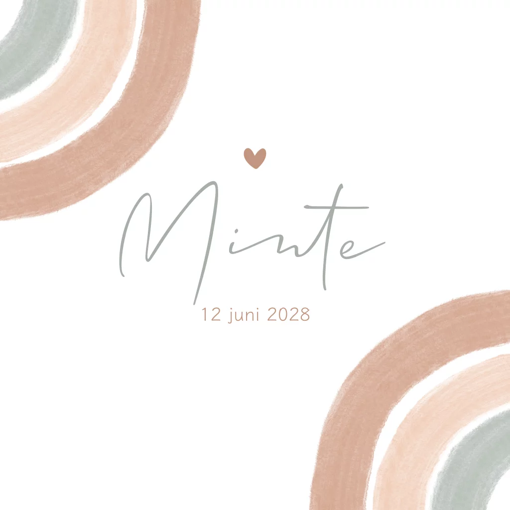 Een stoer maar lief wit geboortekaartje met regenboogjes in oude roze en mint grijs groene kleur. Je past ontwerp Minte eenvoudig en snel aan in onze online editor!