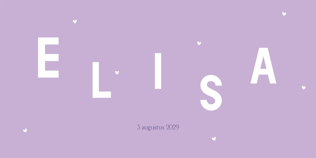 Een trendy geboortekaartje in Lila Paarse kleur met speelse letters. Je kunt het lettertype zelf eenvoudig aanpassen, zo ook de kleur en de compositie.