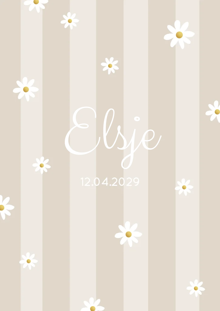 Lief en trendy geboortekaartje Elsje met beige strepen en madeliefjes bloemetjes. Je kunt het eenvoudig aanpassen qua kleur en opmaak.