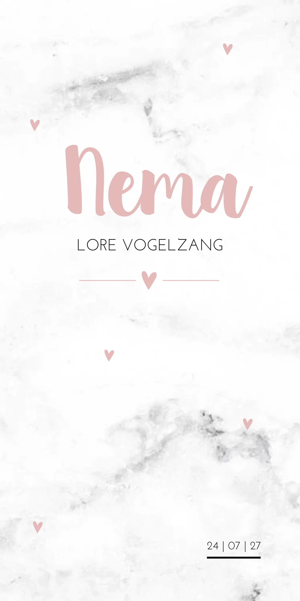 Geboortekaartje met een marmeren achtergrond en lieve roze hartjes. Pas kaartje Nema gemakkelijk naar eigens wens aan in de editor.