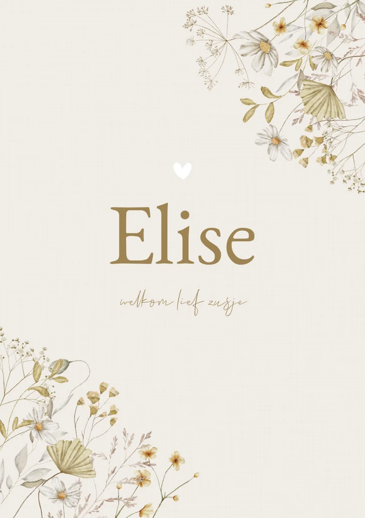 Een romantisch geboortekaartje met een waterverf/aquarel illustratie van verschillende veldbloemen. Op de achtergrond zit een heel licht linnen effect. Kaartje Elise heeft een rustige uitstraling door het gebruik van één kleurenfamilie en wordt door het gebruik van klassieke lettertypes een tijdloos ontwerp. Wil je graag iets aanpassen? Neem dan een kijkje in de editor voor de vele opties!