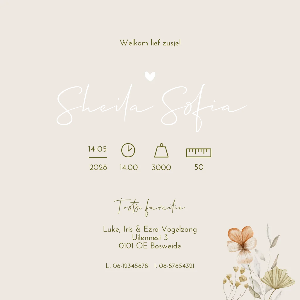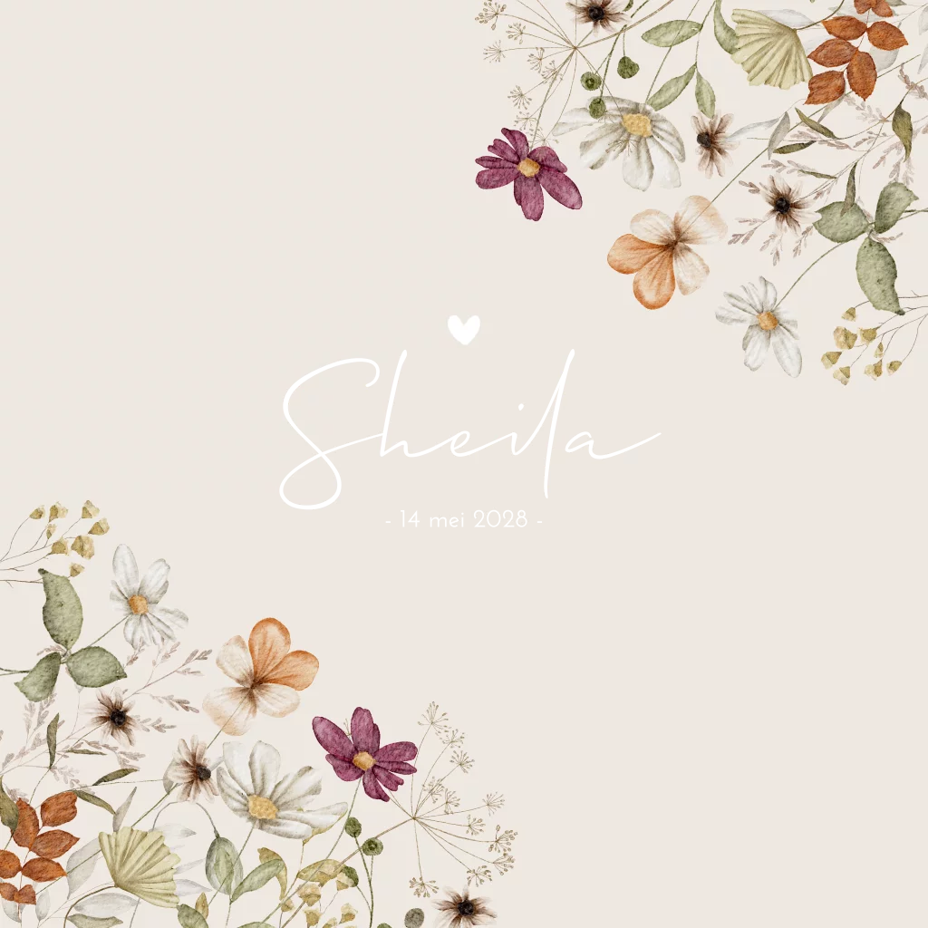 Een lief en romantisch geboortekaartje met allerlei waterverf bloemetjes in diverse kleuren. Op kaartje Sheila staat de naam in koperfolie, dit zorgt voor een chique uitstraling. Wil je graag iets aanpassen? Neem dan een kijkje in onze editor voor de vele opties!
