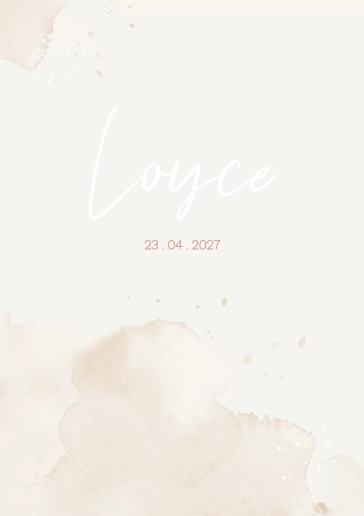 Trendy en hip geboortekaartje Loyce met watercolor/ aquarel effect in beige/ creme kleuren. De goudfolie details in de stipjes en de naam maken het kaartje heel speciaal en luxe. Je kunt de kaart met je eigen gegevens opmaken in de editor!
