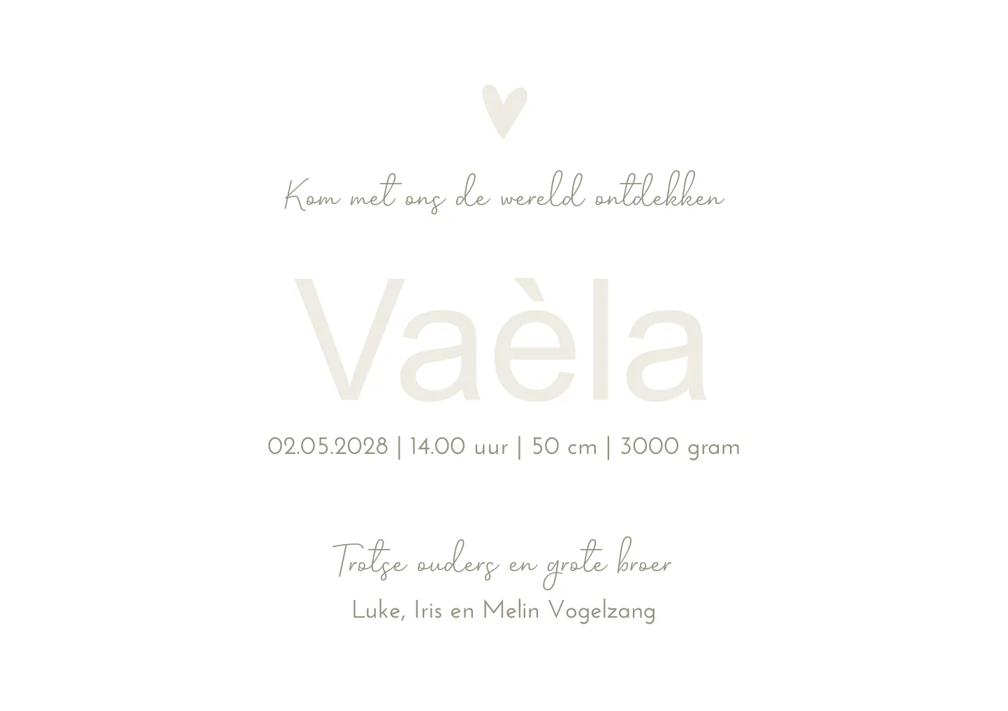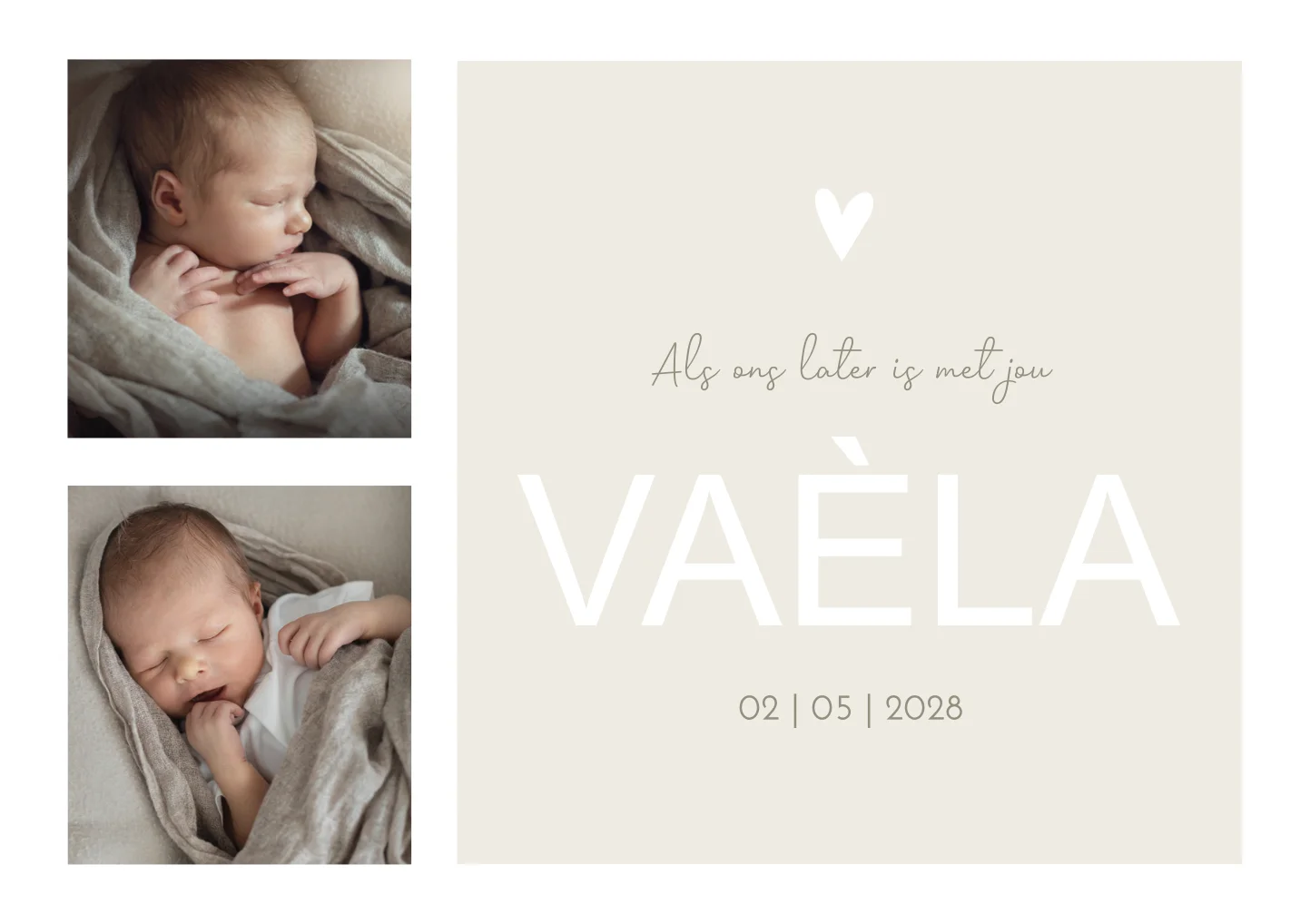 Een tijdloos en strak geboortekaartje met ruimte voor de babyfoto's van je kindje. Heb je zelf mooie foto's kunnen maken of misschien heb je een newbornshoot gepland door een professionele fotograaf, dan is dit een prachtig geboortekaartje voor je kindje! Kaartje Vaèla kun je helemaal zelf aanpassen kleur, opmaak en lettertype. Wil je onze hulp bij de foto's? Mail dan gerust, wij helpen je gratis!