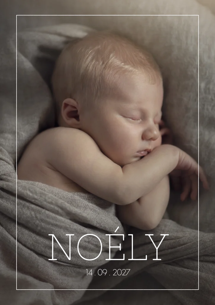 Prachtige fotokaart Noély met een babyfoto van jouw kindje! Je kunt het kaartje helemaal zelf aanpassen naar jouw wensen. De naam is nu in goudfolie gezet maar deze kun je ook omzetten naar een andere kleur of koperfolie bijvoorbeeld. Let er wel op, de foto maakt de kaart! Dus maak een paar verschillende foto's en bekijk welke foto het mooiste uitkomt op de kaart. Wil je hulp bij het bewerken van je foto? Stuur ons een mailtje met de foto, dan passen we de foto voor je aan.