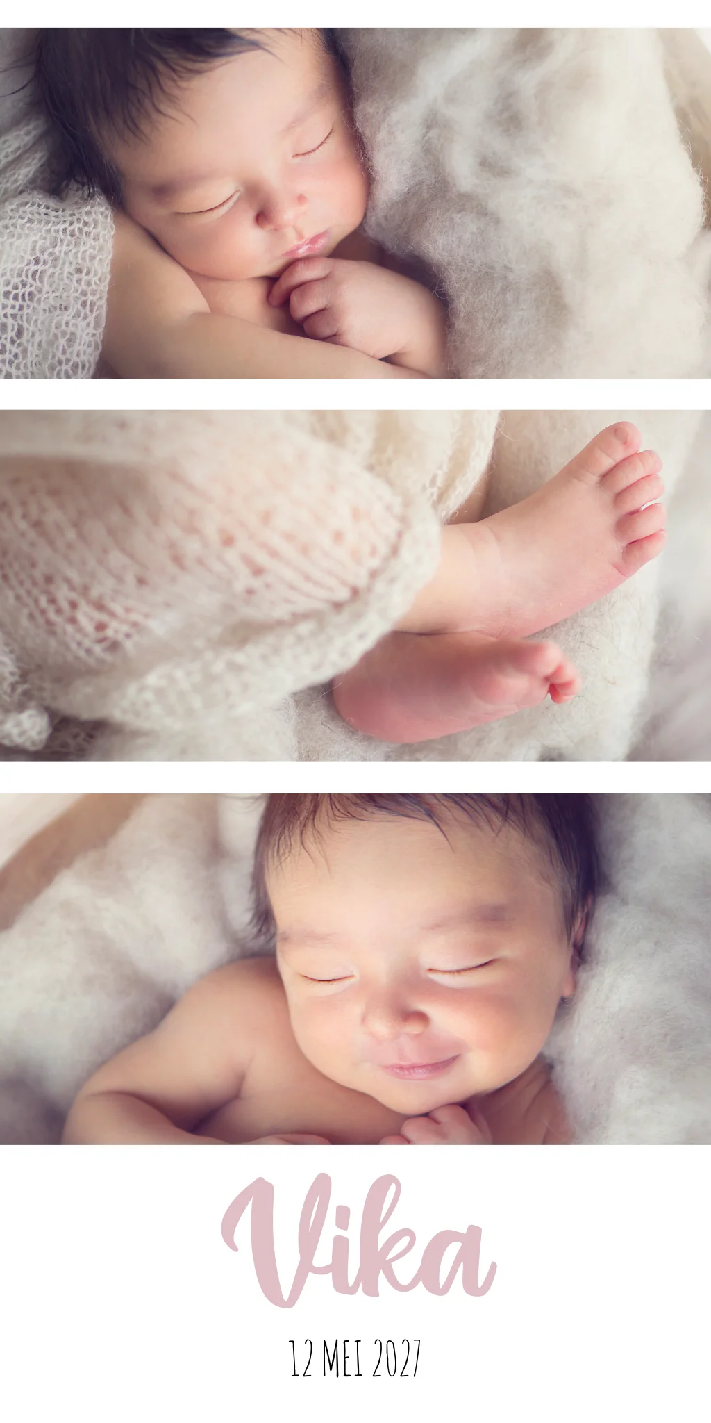 Een mooie strakke foto kaart. Op de voorzijde van kaartje Vika is ruimte voor 3 foto's van jouw kleintje. Een prachtig tijdloos ontwerp! Je kunt de kaart gemakkelijk aanpassen. Zo kun je ook 1 of 2 foto's plaatsen i.p.v. 3. Je maakt het volledig eigen in onze editor!