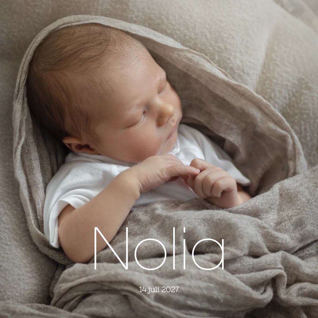 Simpel en chique babyfoto kaart Nolia met goud kleurige letters. Je kunt de naam ook in goudfolie laten drukken. Upload de foto van je eigen kindje en kies je gewenst lettertype en kleur in de editor en maak het kaartje helemaal naar jouw smaak!