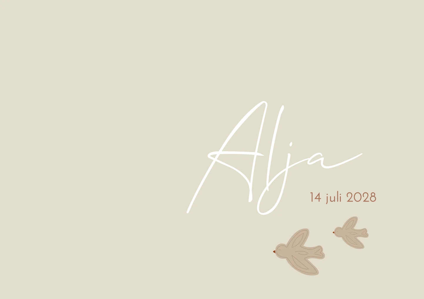 Stijlvol neutraal geboortekaartje Alja in beige/ crème kleur met de naam in koperfolie. 2 vogels/vogeltjes staan centraal op dit kaartje. Deze kaart is gender neutraal en kan voor beide geslachten gebruikt worden. Je maakt dit kaartje extra mooi door een fotolabel aan de linkerkant toe te voegen. Deze fotolabels bestel je los op onze site. Je vindt ze onder het kopje 'voor bij de kaart'. Je past de kaart gemakkelijk en snel aan in onze editor, maak er iets moois van!