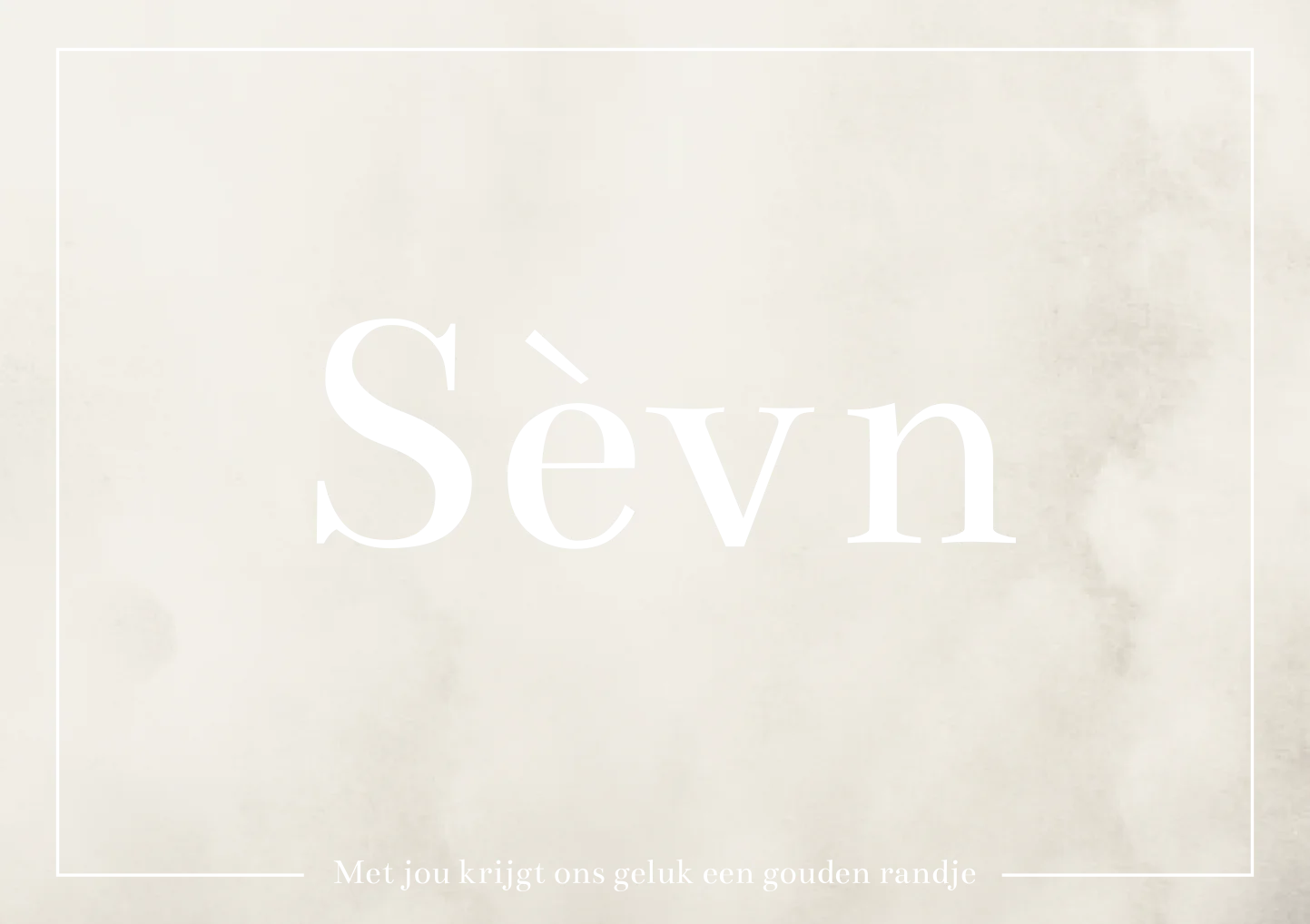 Stijlvolle beige gewolkte kaart in aquarel stijl met een roséfolie randje om de kaart en de toepasselijke tekst: Met jou krijgt ons geluk een gouden randje. Kaart Sèvn is makkelijk aanpasbaar in onze editor, zodat het geheel past bij de stijl van jouw babykamer.