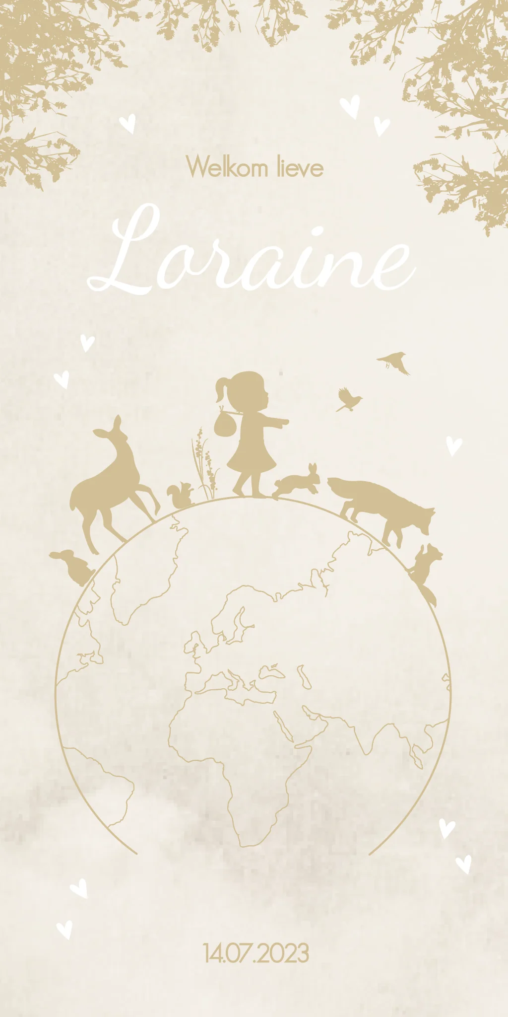 Supermooi baby kaartje Loraine voor een meisje in een gewolkt beige kleur als achtergrond, beige/ crème tinten en witte accenten. De kaart bevat een wereldbol als illustratie met jouw kindje als kleine wereldreiziger en allemaal schattige dieren zoals een konijntje, hertje, eekhoorn, vogels, moedervos met een welpje. Je past de kaart helemaal zelf aan in onze editor!