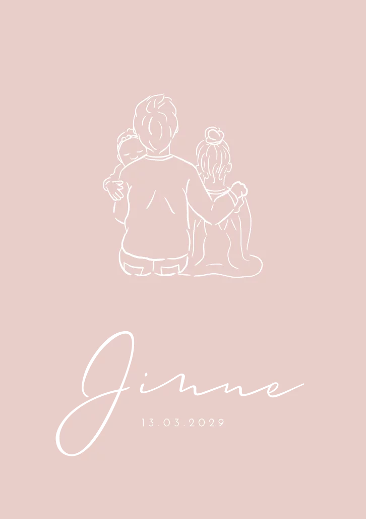 Een zacht roze geboortekaartje met rosefolie. Op kaartje Jinne is een illustratie te zien van een grote broer en zus met hun baby zusje. Ziet jouw gezin er anders uit? In onze beeldbank kun je veel meer soorten lijntekeningen vinden.