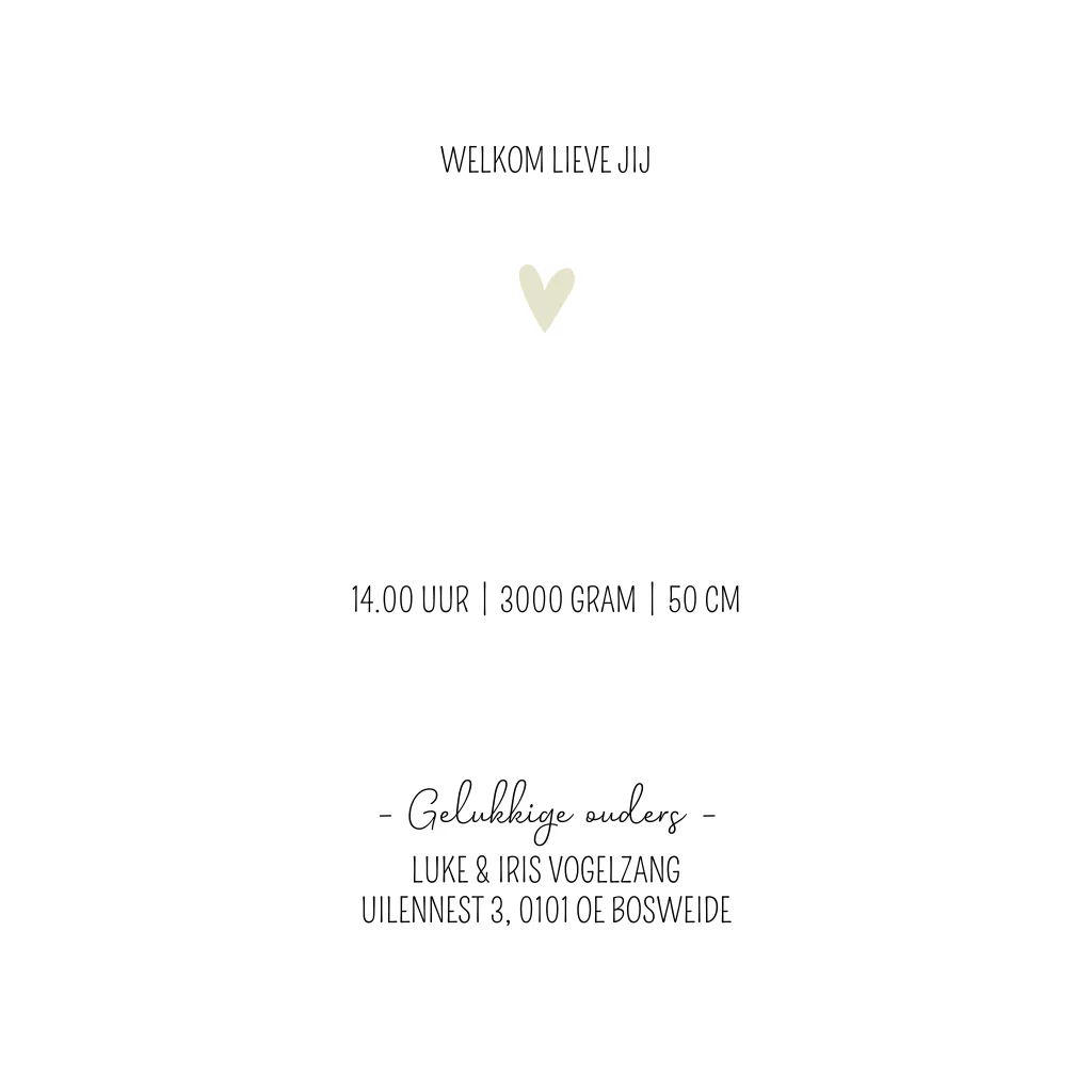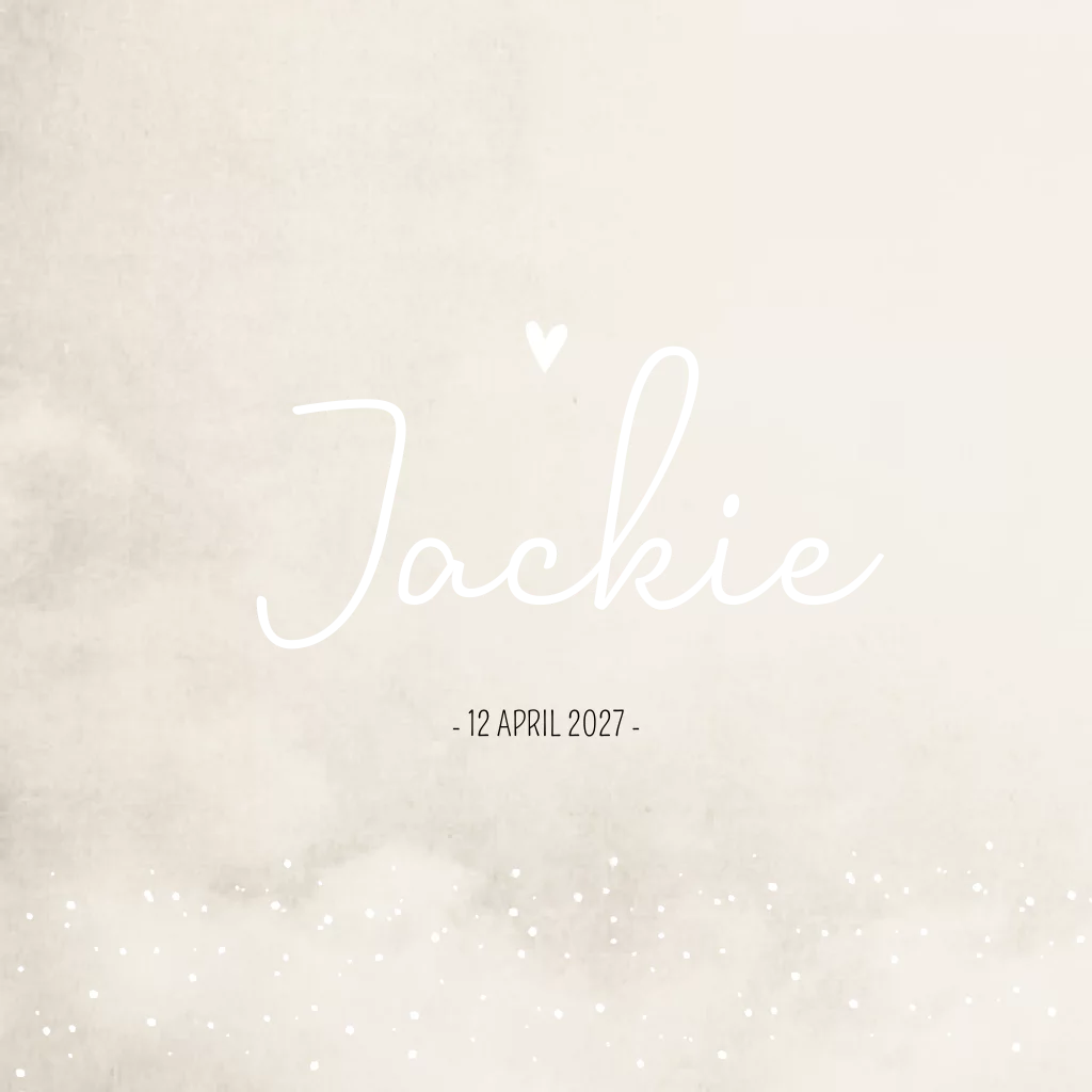Neutraal beige/crème geboorte kaartje met witte stipjes en een witte hartje. Laat de naam bedrukken met koperfolie voor een mooi effect. Geboortekaartje Jackie is ook mooi in goudfolie. Bekijk de verschillende opties in de editor!