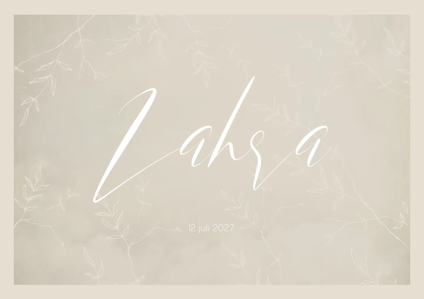 Een beige/ crème geboortekaartje met een gewolkte achtergrond en een camel kleurige omranding en een lijntekening van takjes in de achtergrond. Het kaartje is afgewerkt met goudfolie voor een luxe en chique uitstraling. Kaartje Zahra heeft een klassiek ontwerp. je past hem helemaal zelf aan in onze editor!