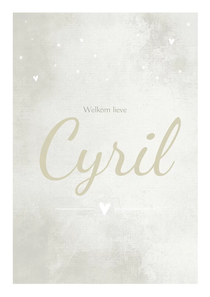 Een rustig en neutraal geboortekaartje, geschikt voor zowel een jongen als een meisje. De kleuren zijn beige/ crème en wit. In kaart Cyril zie je sterretjes en hartjes voor een speels effect. Wil je de kaart toch wat kleur geven? Dit kun je gemakkelijk zelf doen in de editor!