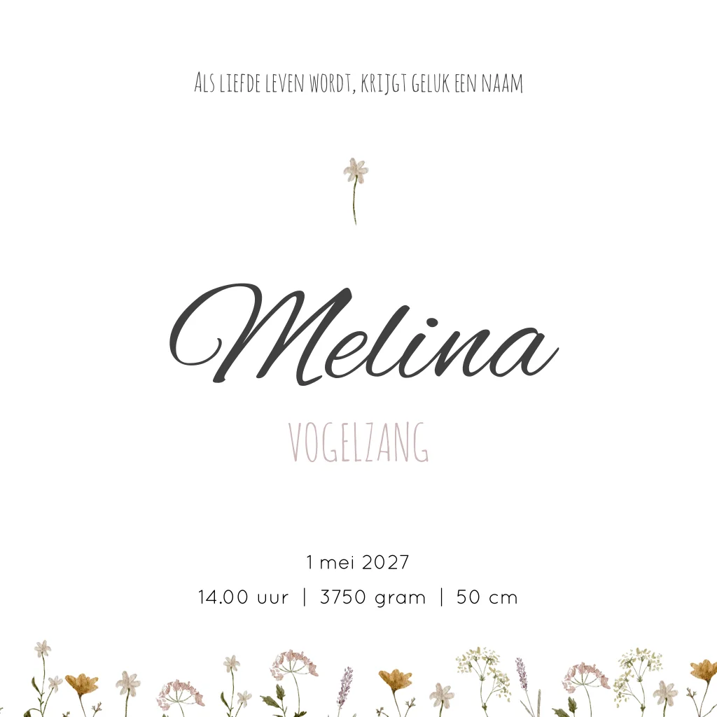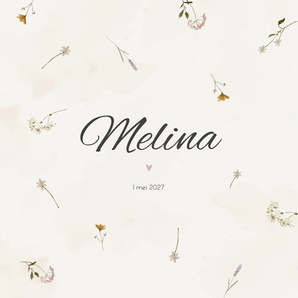 Een vrolijk en hip geboortekaartje met verschillende bloemetjes op de kaart. Kaartje Melina heeft een licht waterverf effect op de achtergrond. Tip van de maker! Kies voor gebobbeld papier, zo komt het effect nog mooier tot z'n recht!