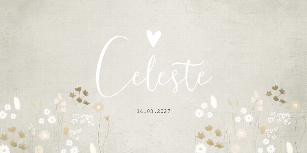 Prachtig geboortekaartje Celeste met allerlei soorten bloemen in beige/ crème tinten. Een klein subtiel detail in goud maakt het extra chique. Dit kaartje is echt een schitterend luxe kaartje voor een meisje. Wil je de kleuren aanpassen? Dat kan, je maakt de kaart volledig naar jouw stijl in onze editor!