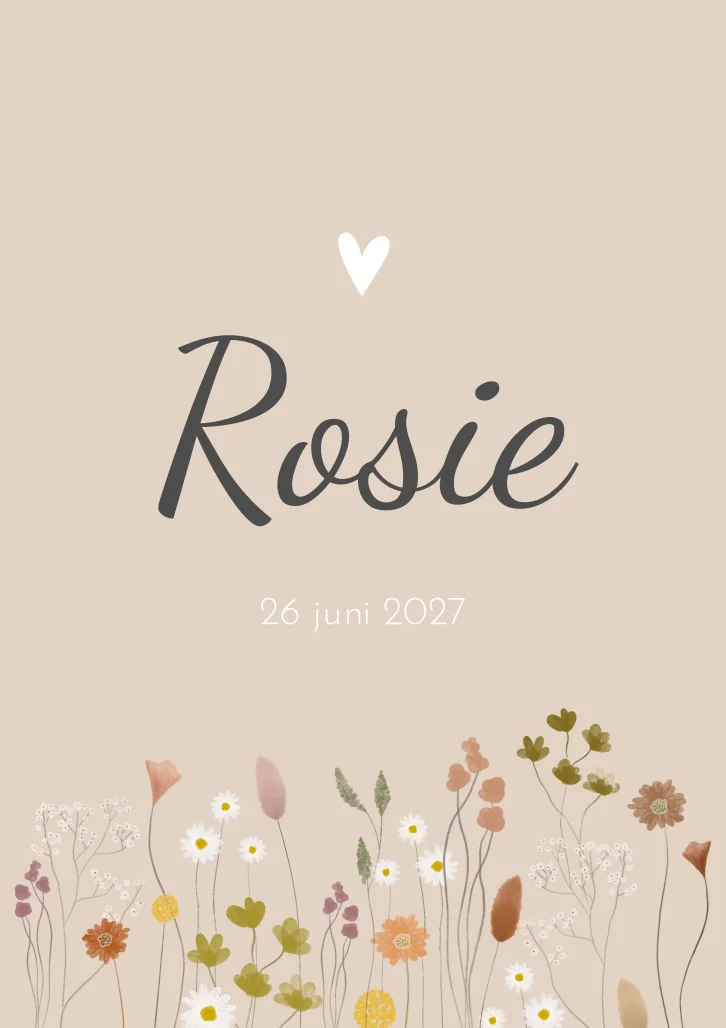 Superlief en hip beige/roze geboortekaartje Rosie Hanna met allerlei soorten bloemen in diverse kleuren. Alle tekst en kleuren zijn aanpasbaar naar jouw wensen, je maakt het dan ook helemaal zelf in onze editor!