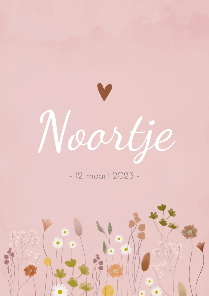 Superlief en hip beige/roze geboortekaartje Noortje Sofie met allerlei soorten bloemen in diverse kleuren. Alle tekst en kleuren zijn aanpasbaar naar jouw wensen, je maakt het dan ook helemaal zelf in onze editor!