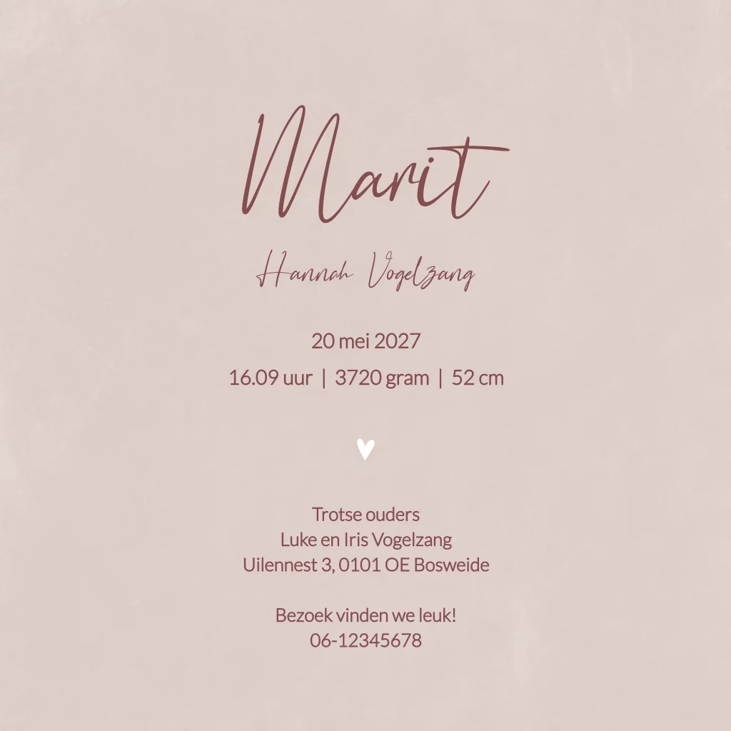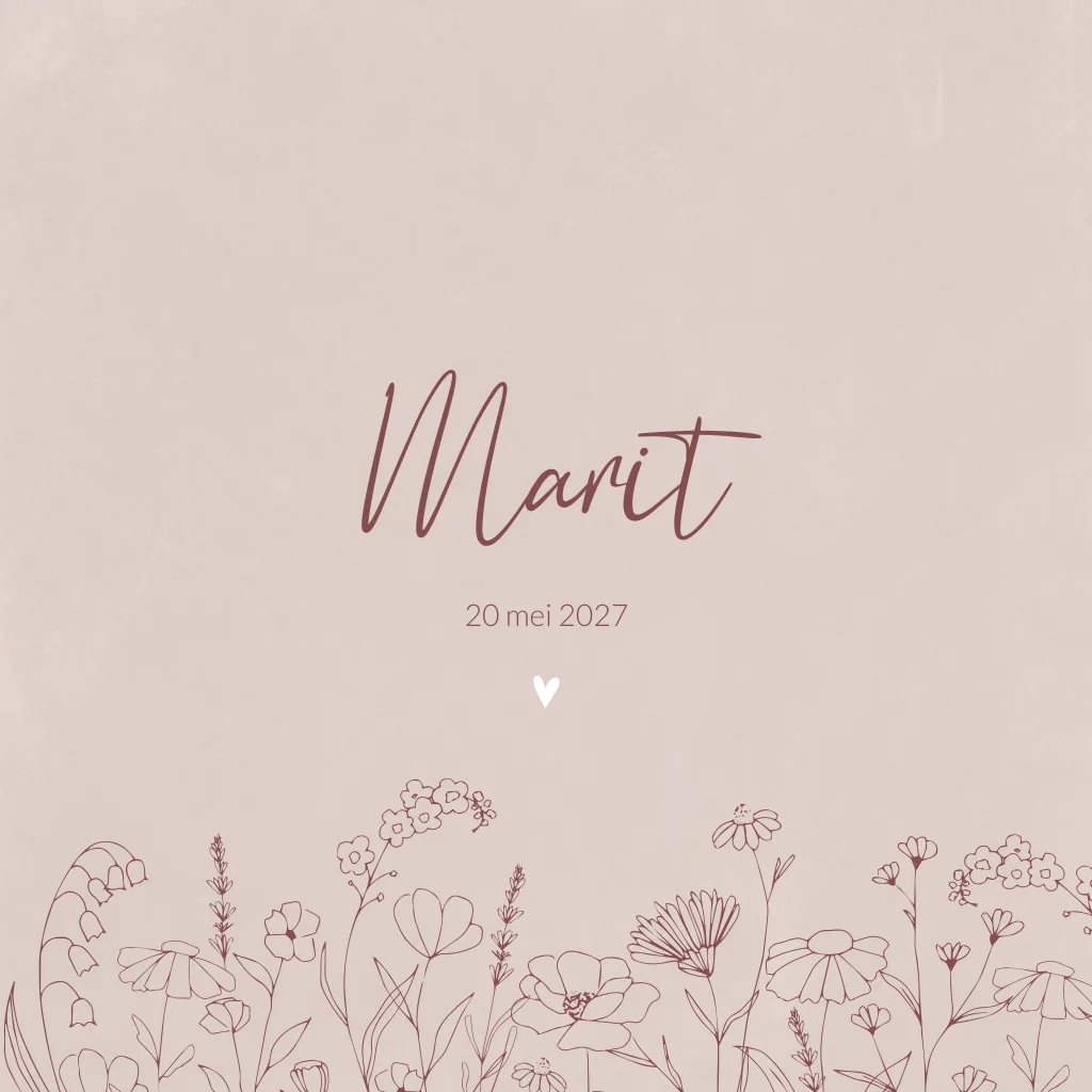Een schattig oud roze geboortekaartje met een getekend bloemenveld. Kaartje Marit is erg mooi op gebobbeld papier.
