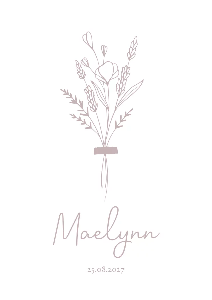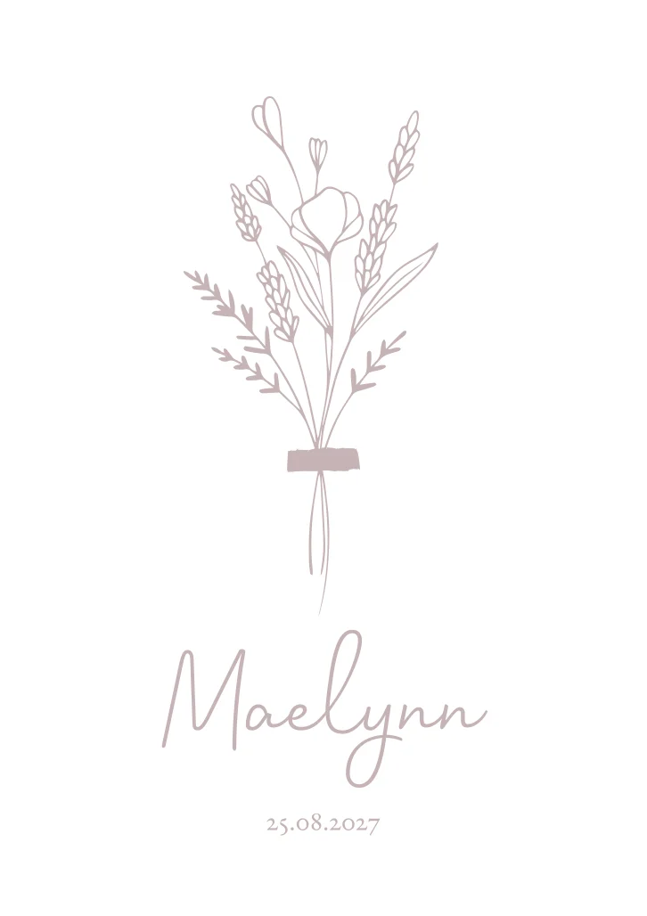 Een neutraal geboortekaartje met een licht lila bloemenboeket. Kaartje Maelynn is een lief en romantisch kaartje. Wil je graag de geboortebloem op het kaartje? Pas dit dan gemakkelijk zelf aan in onze editor!