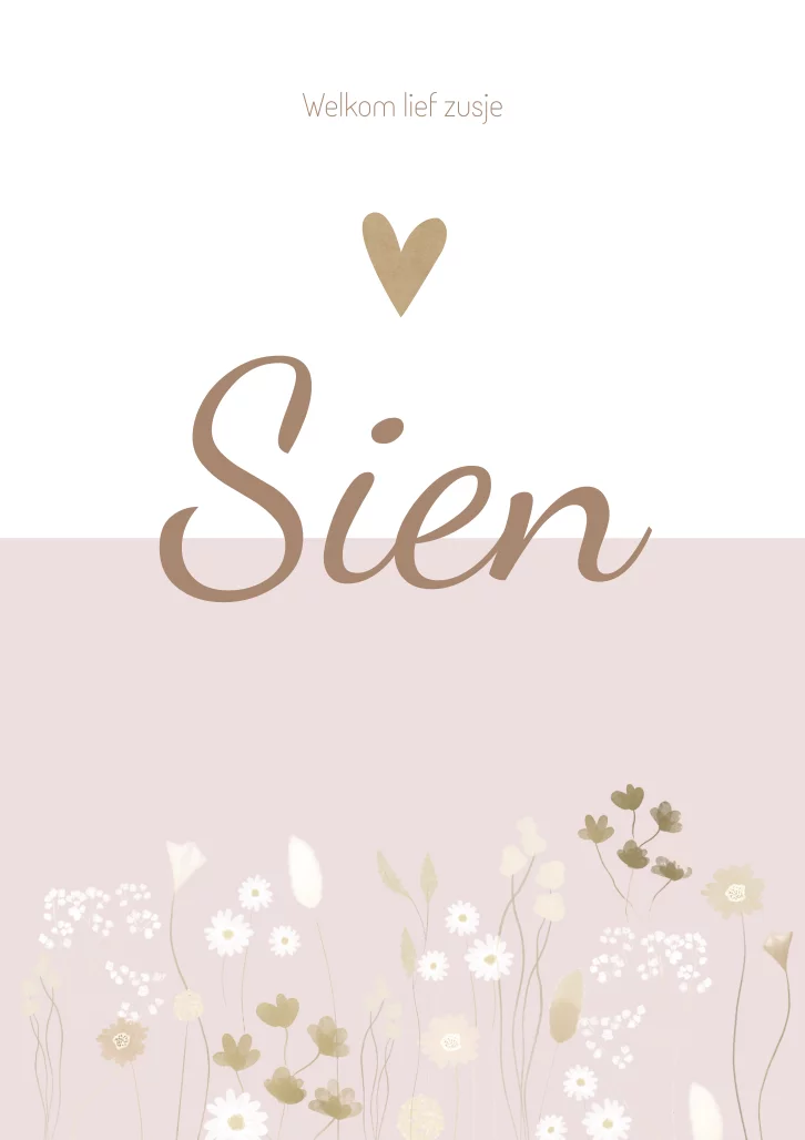 Lief, zacht roze geboorte kaartje voor een meisje met veel droogbloemen/ een bloemenveld in lichte beige neutrale kleuren. Het licht bruine hartje geeft het kaartje net een beetje contrast. Zie jij kaartje Sien liever anders voor je? Je kunt het helemaal zelf samenstellen in onze editor!