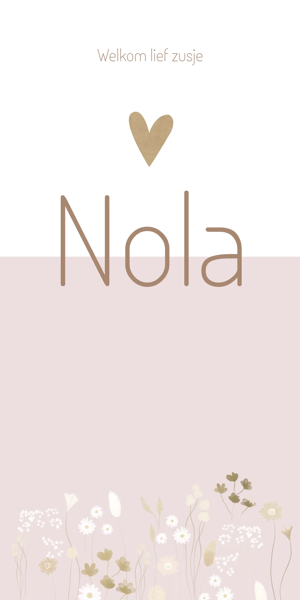 Lief, zacht roze geboorte kaartje voor een meisje met veel droogbloemen/ een bloemenveld in lichte beige neutrale kleuren. Het licht bruine hartje geeft het kaartje net een beetje contrast. Zie jij kaartje Nola liever anders voor je? Je kunt het helemaal zelf samenstellen in onze editor!