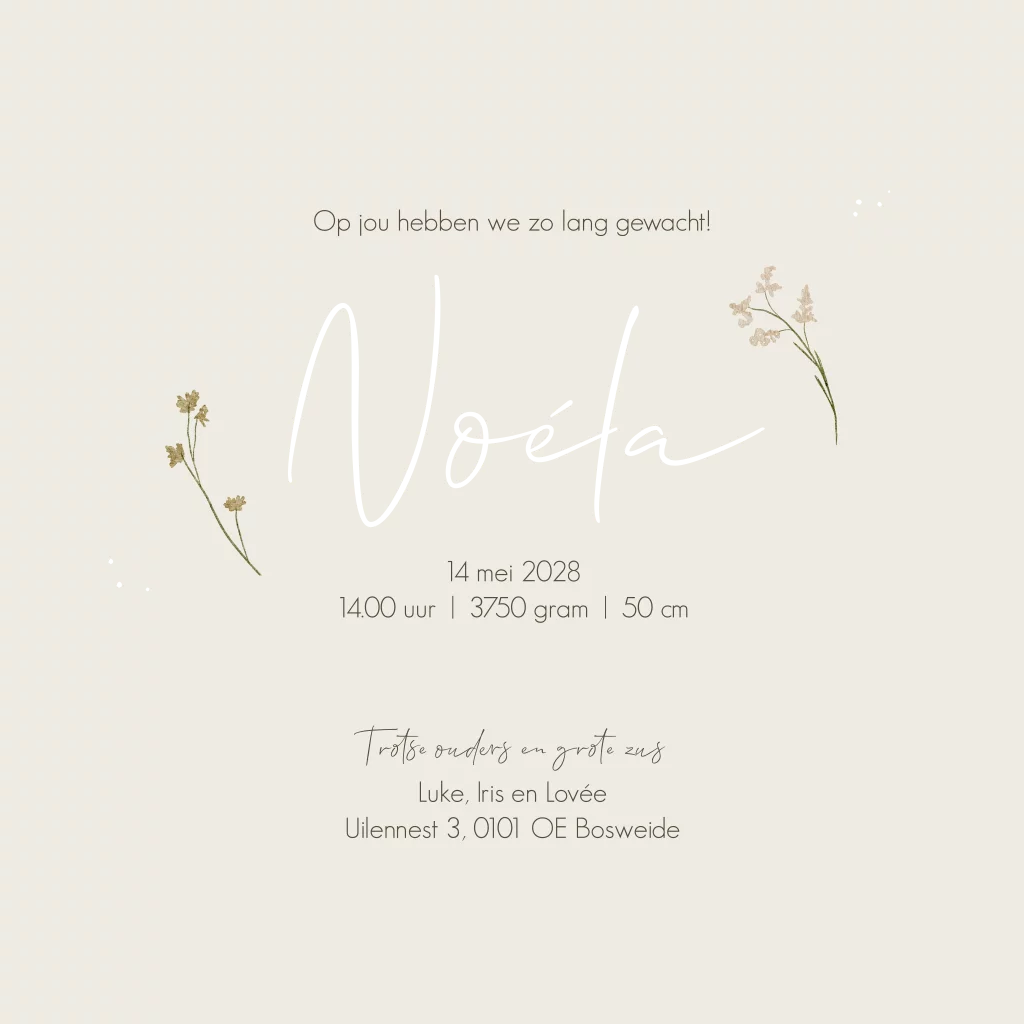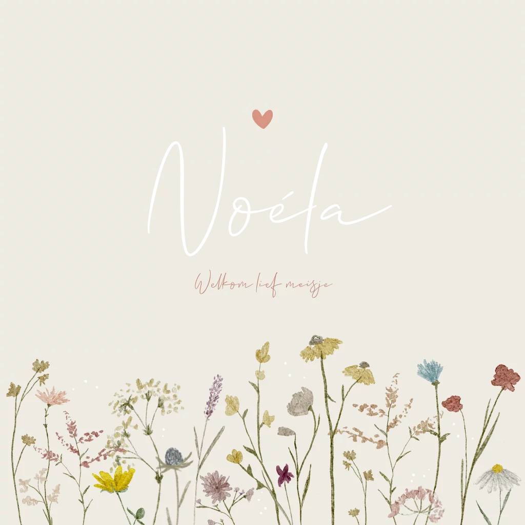 Super lief en tijdloos geboortekaartje Noéla voor een meisje, met diverse soorten en kleuren bloemen. Je kunt alle bloemen zelf verplaatsen/ verwijderen/ nieuwe toevoegen. In onze beeldbank zie je alle mogelijkheden aan bloemen. De kaart wordt extra mooi als je het met foliedruk laat bedrukken. Zo krijgt het een luxe en chique uitstraling.