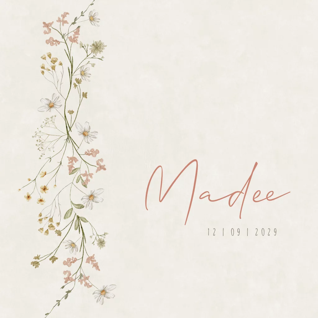 Een beige/ crème velvet/ suède look babykaartje voor een meisje met allerlei bloemetjes. De bloemenstrook maken het kaartje zacht en fris maar ook tijdloos. Je kunt de bloemen zelf aanpassen van baby kaartje Madee en neem een kijkje in onze editor om nog meer bloemen te vinden.