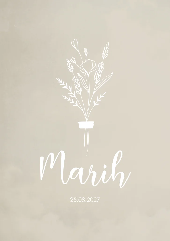 Hip en modern geboortekaartje in beige crème kleur met een wit bloemen boeketje van droogbloemen. De naam Marih is in sierlijke letters op de kaart gezet en de verdere tekst in een strak lettertype. Wil je het graag aanpassen zodat het naar jouw smaak is? Je doet het in onze editor!