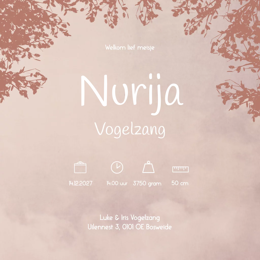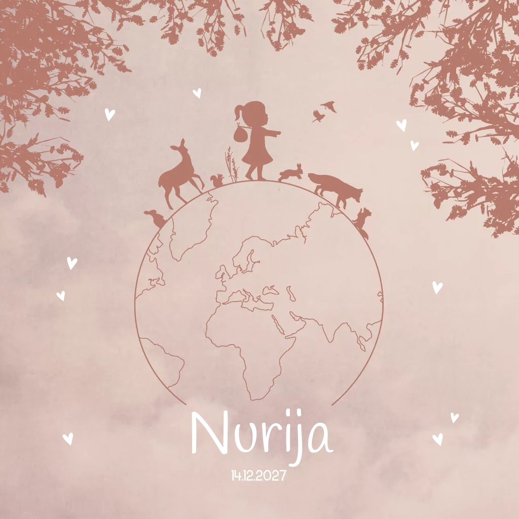 Zacht roze kaartje met wereldbol en bosdieren. Geboortekaartje Nurija heeft de naam en de hartjes in roséfolie en bevat een konijntjes, een reetje/hertje, eekhoorn, vosjes en vogeltjes die lopen over de wereldbol samen met een meisje. Heb je liever een ander dier? Geen probleem, kies jouw favoriete dier in onze editor en plaats hem op het kaartje. Staat jouw gewenste dier niet in de editor? Neem dan gerust contact met ons op.
