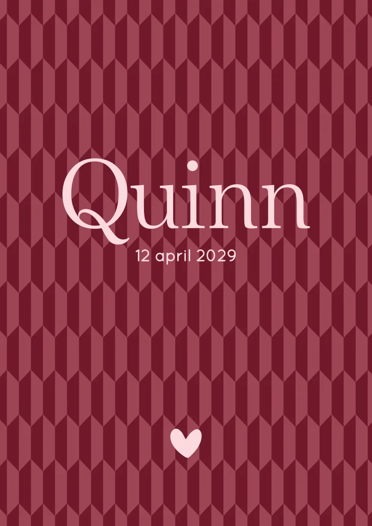 Dit kaartje Quinn is helemaal de trend van nu! Het chevron patroon in de rood en roze kleuren zie je vaak terug in interieur en behang voor de babykamer. De kleuren en het patroon kun je heel makkelijk aanpassen.