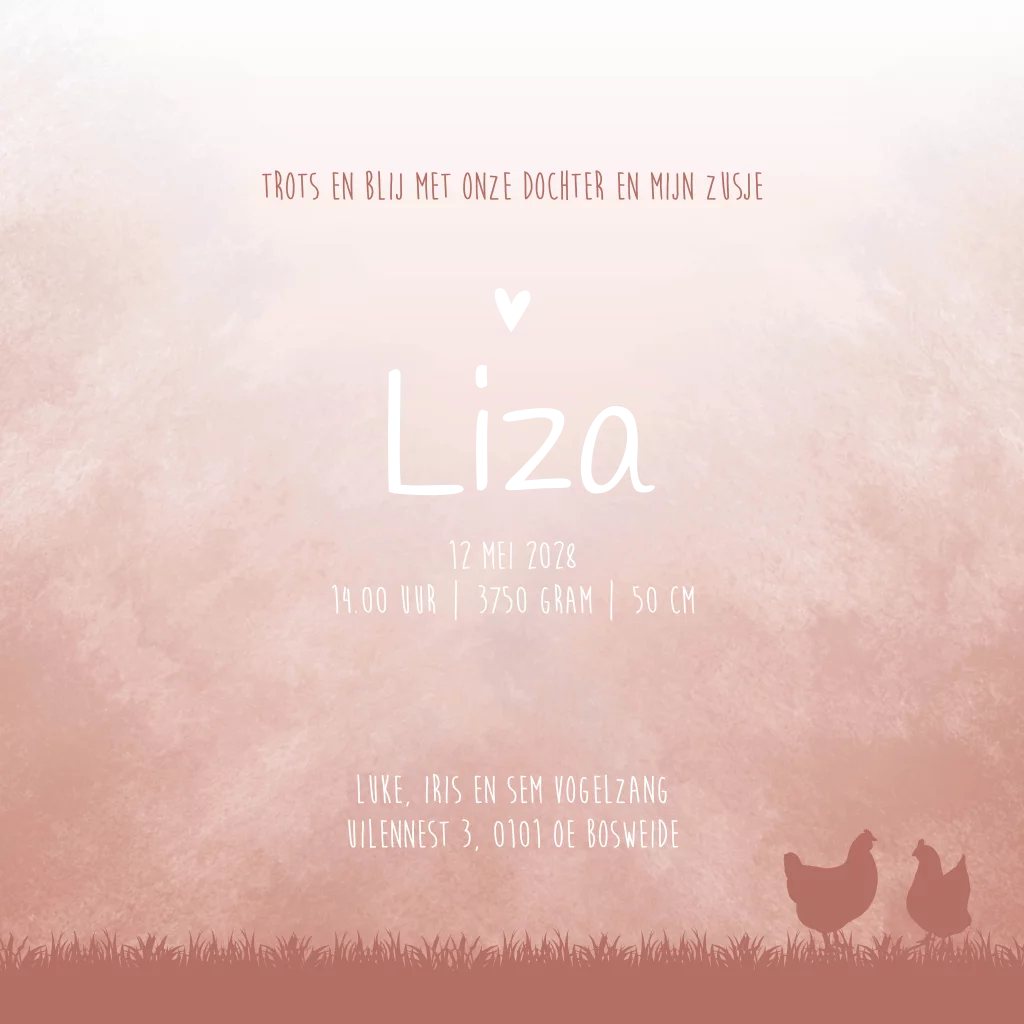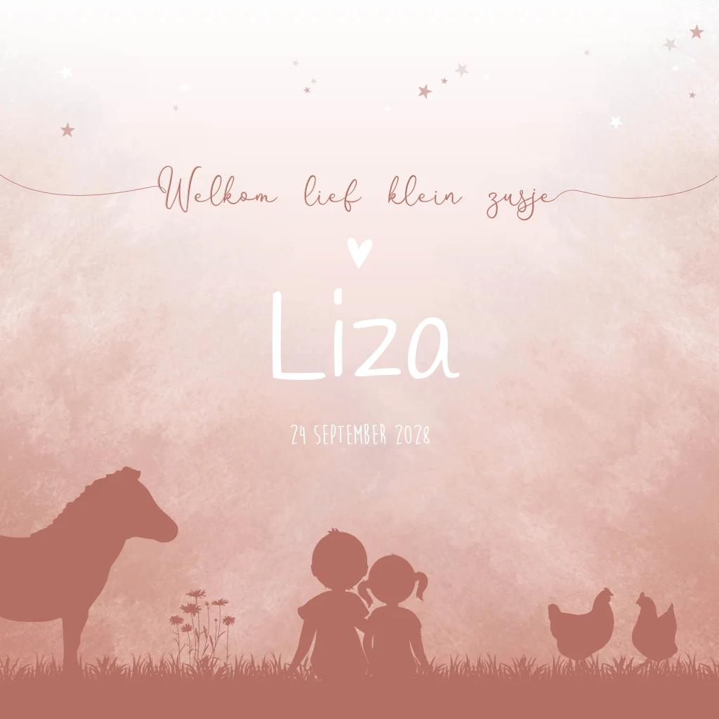Een oudroze gevlekt geboortekaartje met een illustratie van een een shetlander paardje, kippetjes/ kippen en een broer met een zusje/ 2 kindjes op de voorzijde. Op de kaart zijn ook de hond en vogels te zien. Wil je graag kaartje Liza aanpassen naar jouw gezinssituatie? Pas dan gemakkelijk de kaart aan in onze editor.