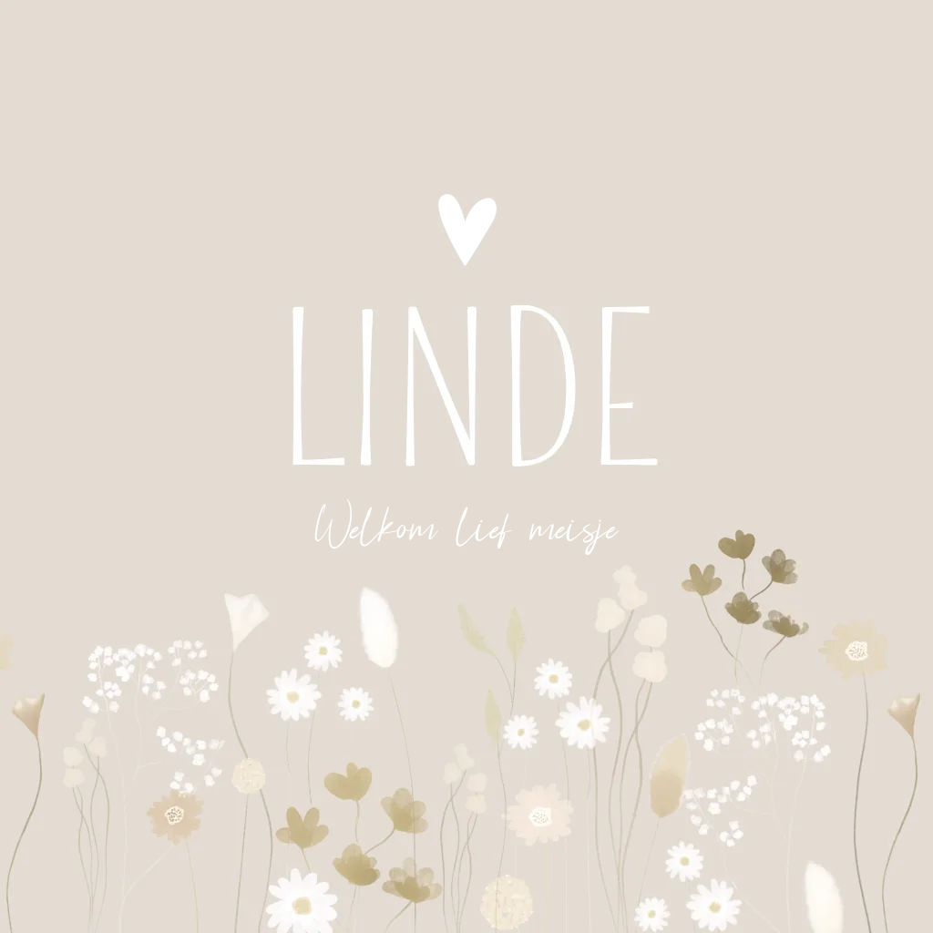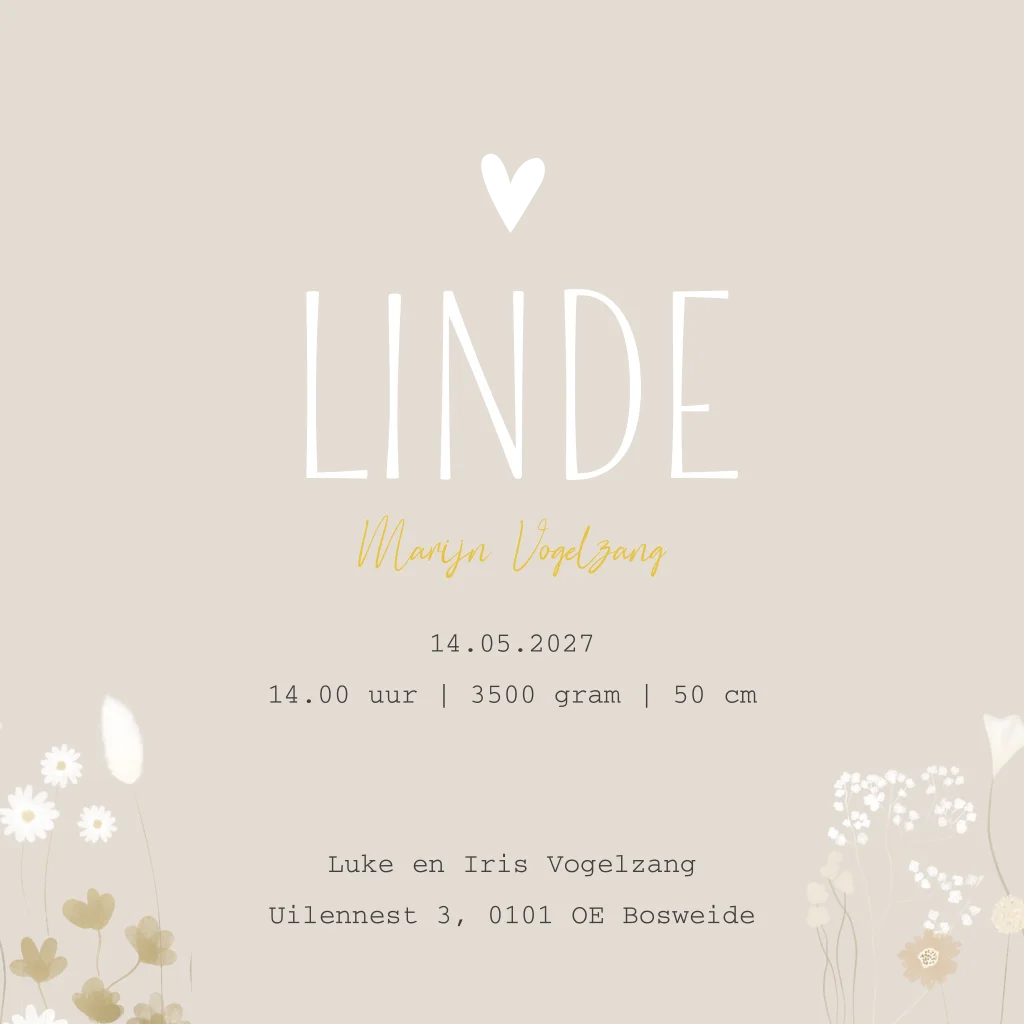 Zacht beige geboortekaartje met lichte kleuren bloemen zoals wit, crème en taupe tinten. Het gouden hartje maakt kaart Linde helemaal af.