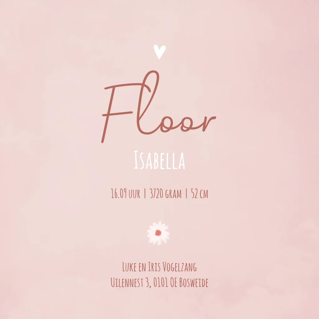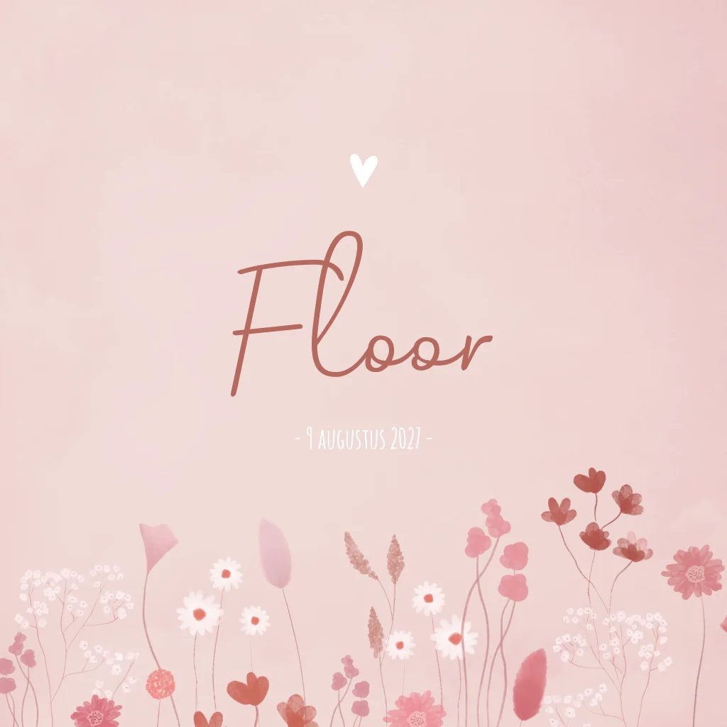 Een lief geboortekaartje met een getekend bloemenveld van droogbloemen. Kaartje Floor is door de roze kleur extra schattig.