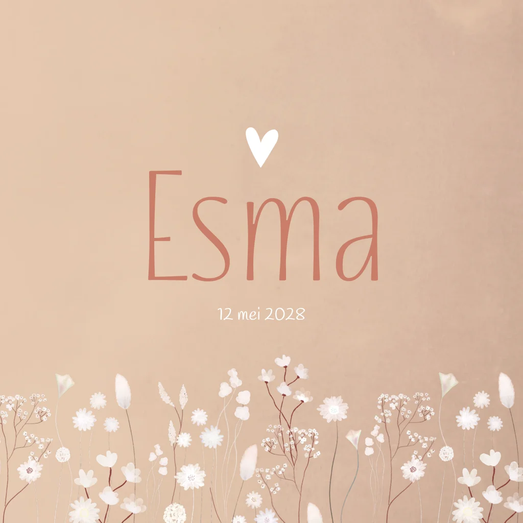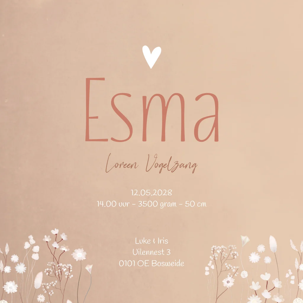 Zacht beige geboortekaartje met lichte zalm roze kleuren bloemen zoals wit, crème en taupe tinten. Je kunt dit ontwerp volledig aanpassen naar je eigen wensen. Wil je onze vrijblijvende hulp? App of mail ons dan eventjes!