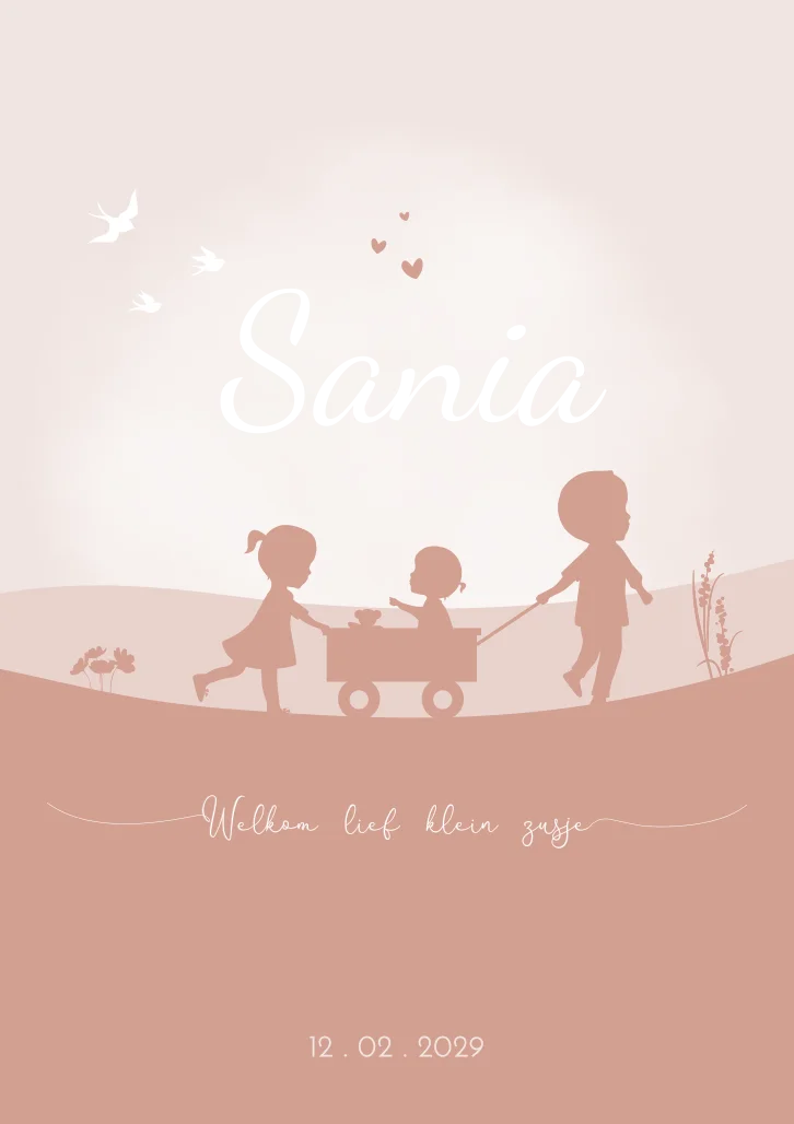 Een schattig geboortekaartje Sanira met een tafereel dat zich in de natuur afspeelt. Grote broer en zus spelen in de natuur met hun kleine zusje. Er staan gezellige bloemetjes om de speelweide. Je past dit kaartje eenvoudig zelf aan, andere silhouetten en dieren zijn ook zeker mogelijk. Kom je er niet uit, mail of app ons dan even, dan helpen we je graag!