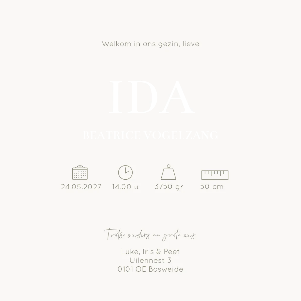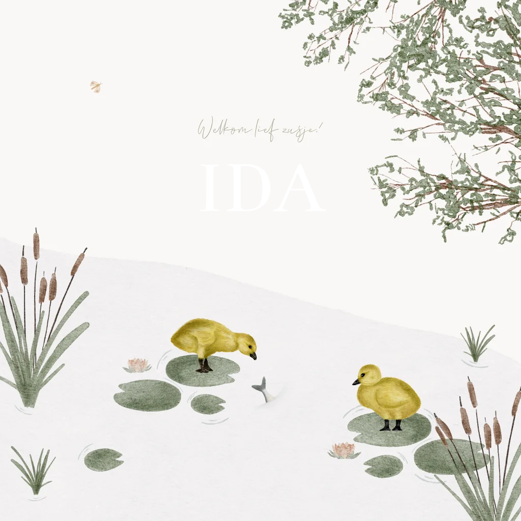 Een lief geboortekaartje met twee kleine eendjes in waterverf stijl. De twee eendjes staan op een lelieblad in een vijvertje. Wil je kaartje Ida graag aanpassen? Neem dan een kijkje in onze editor voor de vele opties!