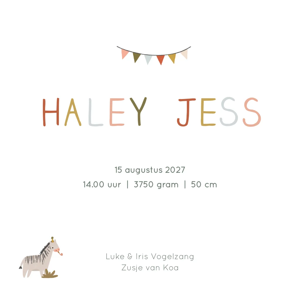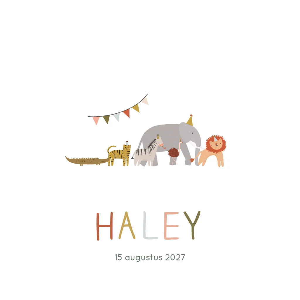 Party Animals! Natuurlijk is het een feestje met een kleine erbij! Dit schattige vrolijke geboortekaartje heeft een dierenparade op de voorzijde met feesthoedjes en een slinger. De letters van de naam op kaartje Haley staan in verschillende kleuren om het kaartje nog vrolijker te maken. Wil je graag iets aanpassen? Dat kan! Alle elementen zijn aanpasbaar.