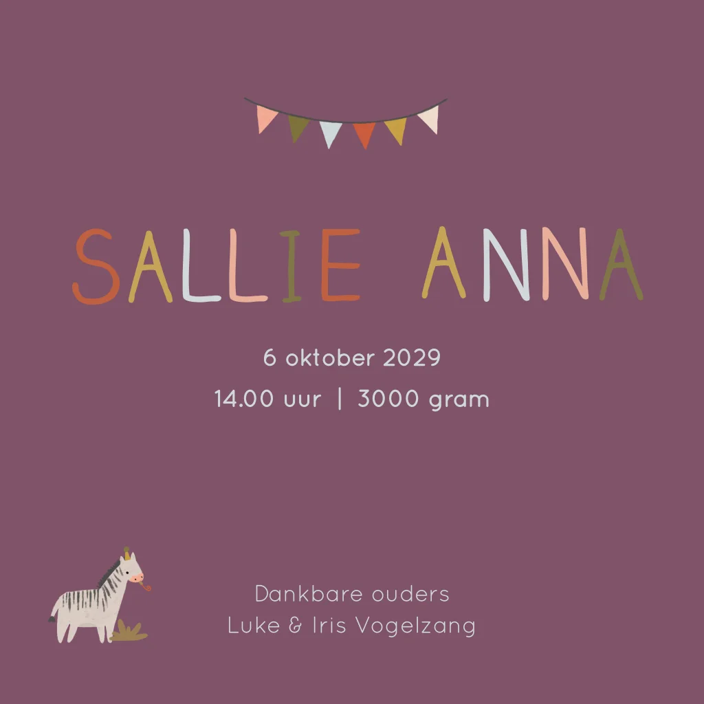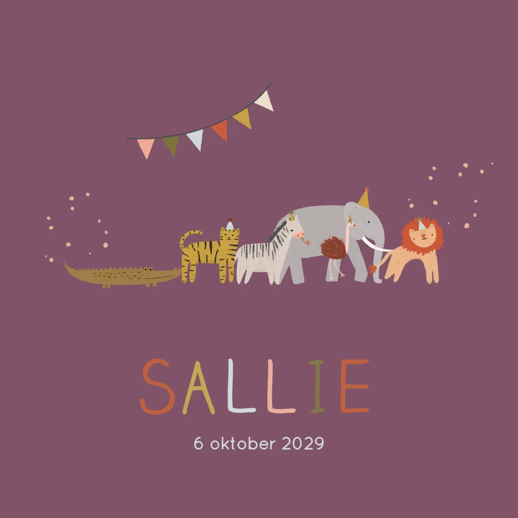 Party Animals! Natuurlijk is het een feestje met een kleine erbij! Dit schattige vrolijke mauve paars/ aubergine kleurige geboortekaartje heeft een dierenparade op de voorzijde met feesthoedjes en een slinger. De letters van de naam op kaartje Sallie staan in verschillende kleuren om het kaartje nog vrolijker te maken. Wil je graag iets aanpassen? Dat kan! Alle elementen zijn aanpasbaar.