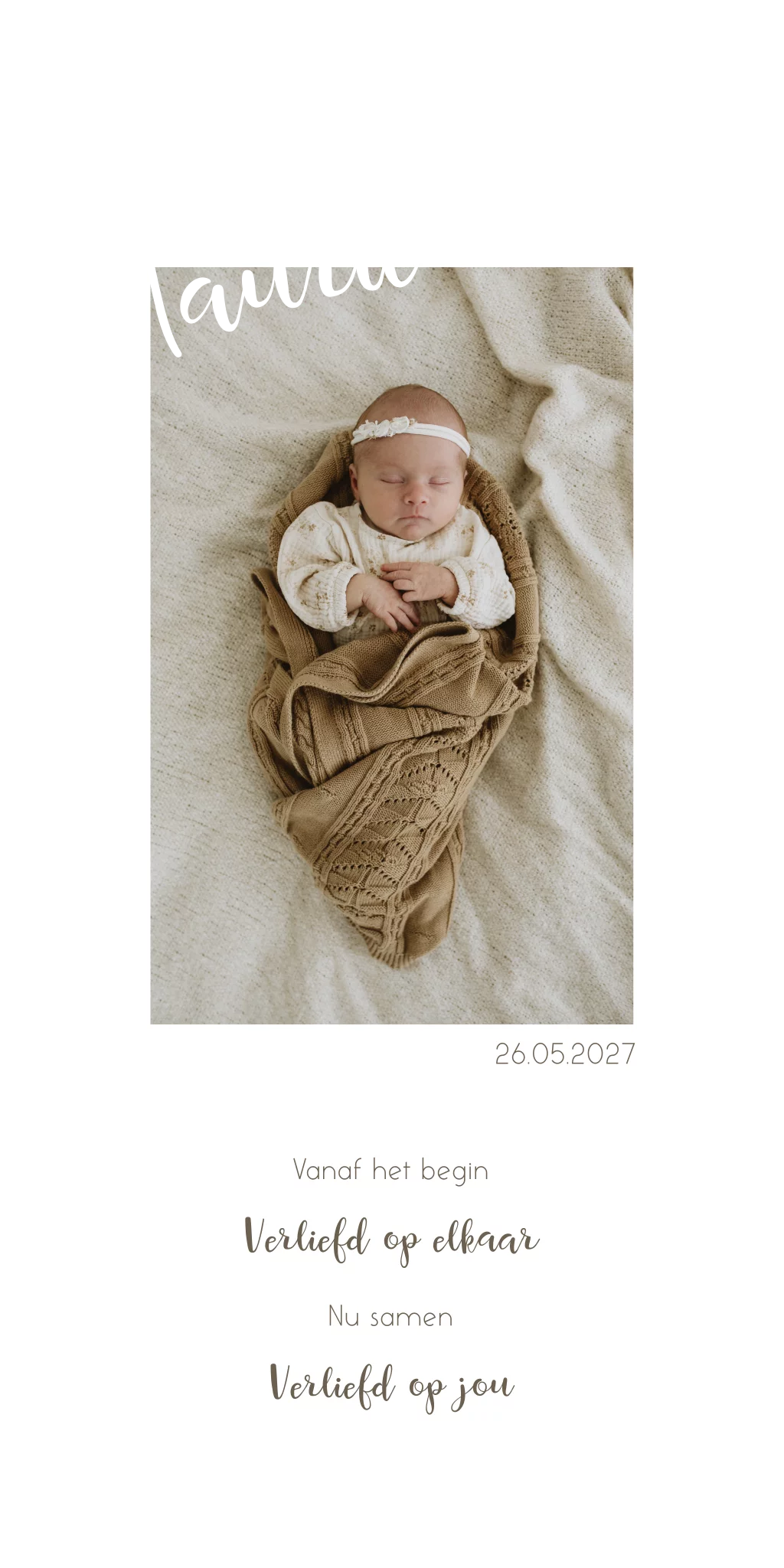 Een mooie fotokaart met goudfolie. Op kaartje Maurie staat de naam op een speelse wijze iets over de foto heen. Op de voorzijde is ook ruimte voor een mooi gedichtje. De goudfolie maakt het kaartje helemaal af!