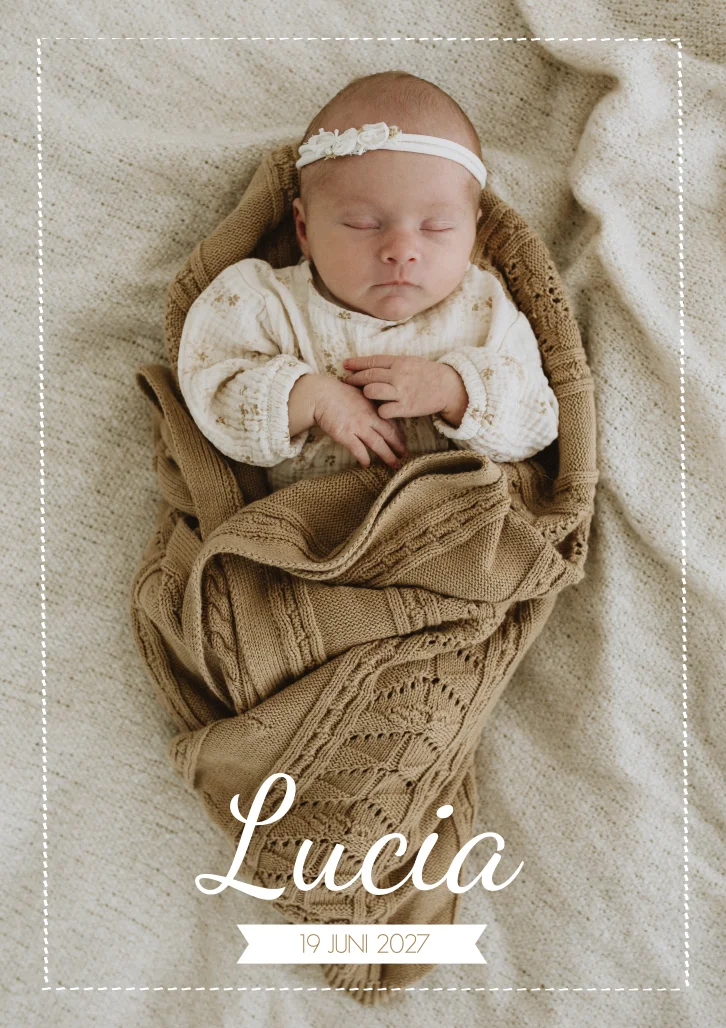 Een mooi geboortekaartje met een grote foto op de voorzijde van de kaart. Op kaartje Lucia staat een stippellijn als omranding. Wil je graag onze hulp met het opmaken van de kaart? Neem dan gerust contact met ons op!
