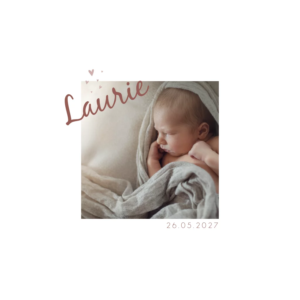 Een neutraal geboortekaartje met hartjes en ruimte voor een foto. Kaartje Laurie is de perfecte combinatie tussen lief en modern.