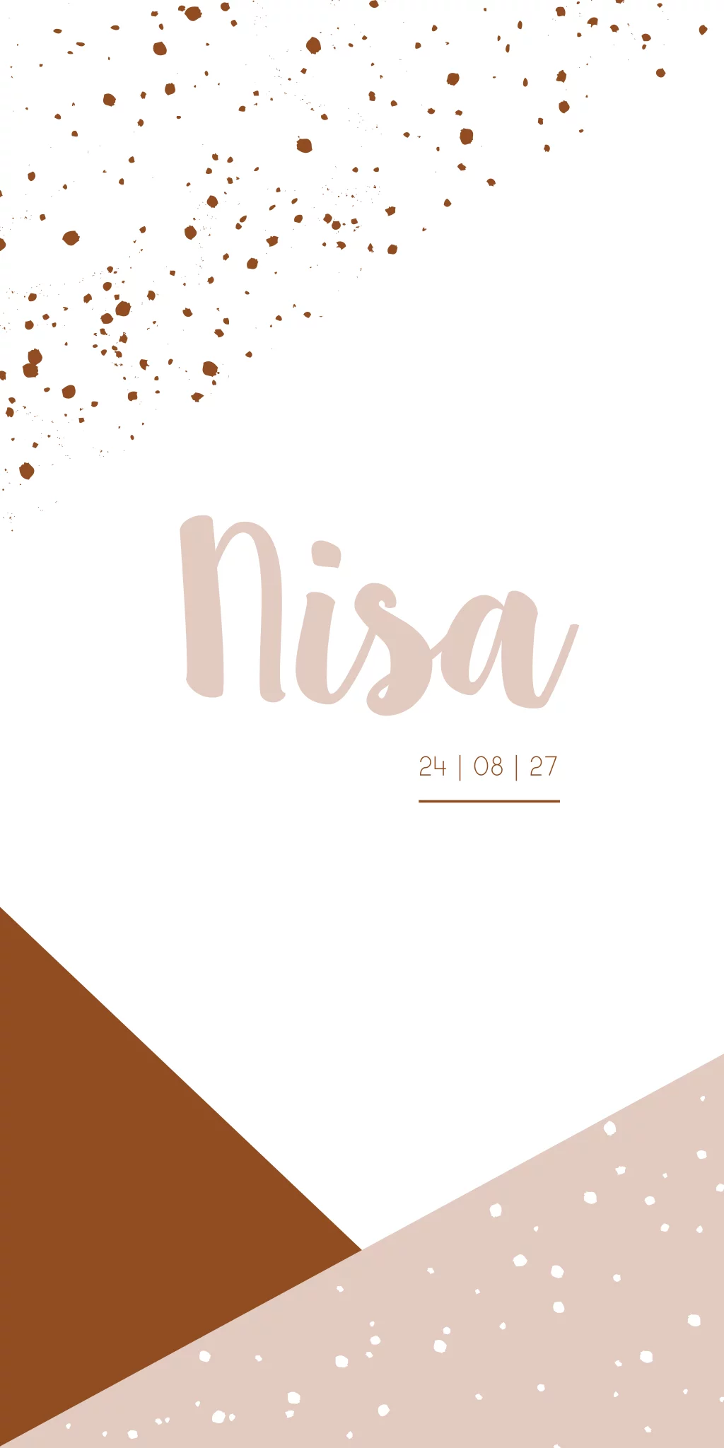 Een stoer geboortekaartje met geometrische vormen en stippen in roest en roze kleuren. Op kaartje Nisa zijn ook stipjes op de kaart gezet voor een speels effect. Wil je graag iets aanpassen? Neem dan een kijkje in onze editor voor alle mogelijkheden!