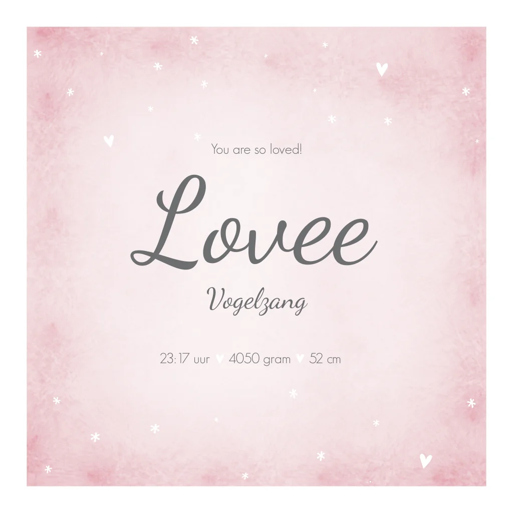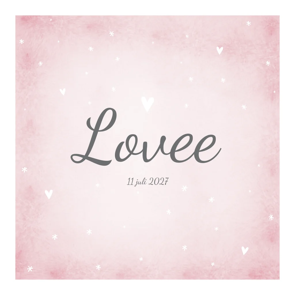 Lief roze geboortekaartje. Het geboortekaartje Lovee is ook erg mooi met koperfolie. Bekijk de verschillende opties in de editor.