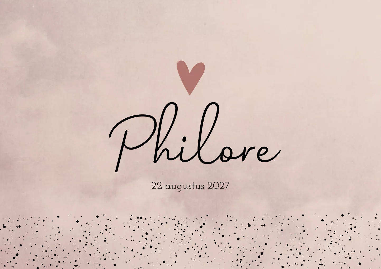 Lief en stoer babykaartje Philore met zacht oude roze gewolkte achtergrond met zwarte letters en een roze hartje. De zwarte stipjes geven het kaartje een speels effect. Wil je dit kaartje voor jouw kindje ontwerpen? Maak er wat moois van in onze editor!