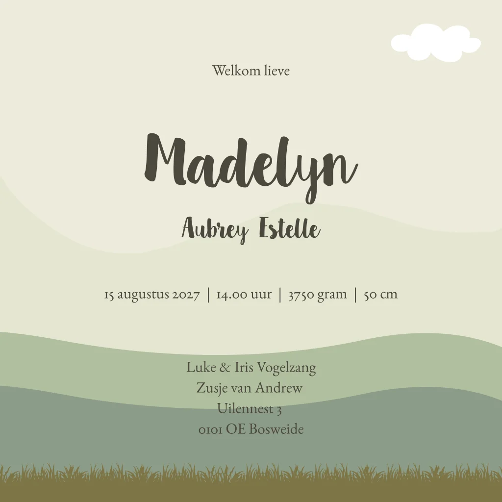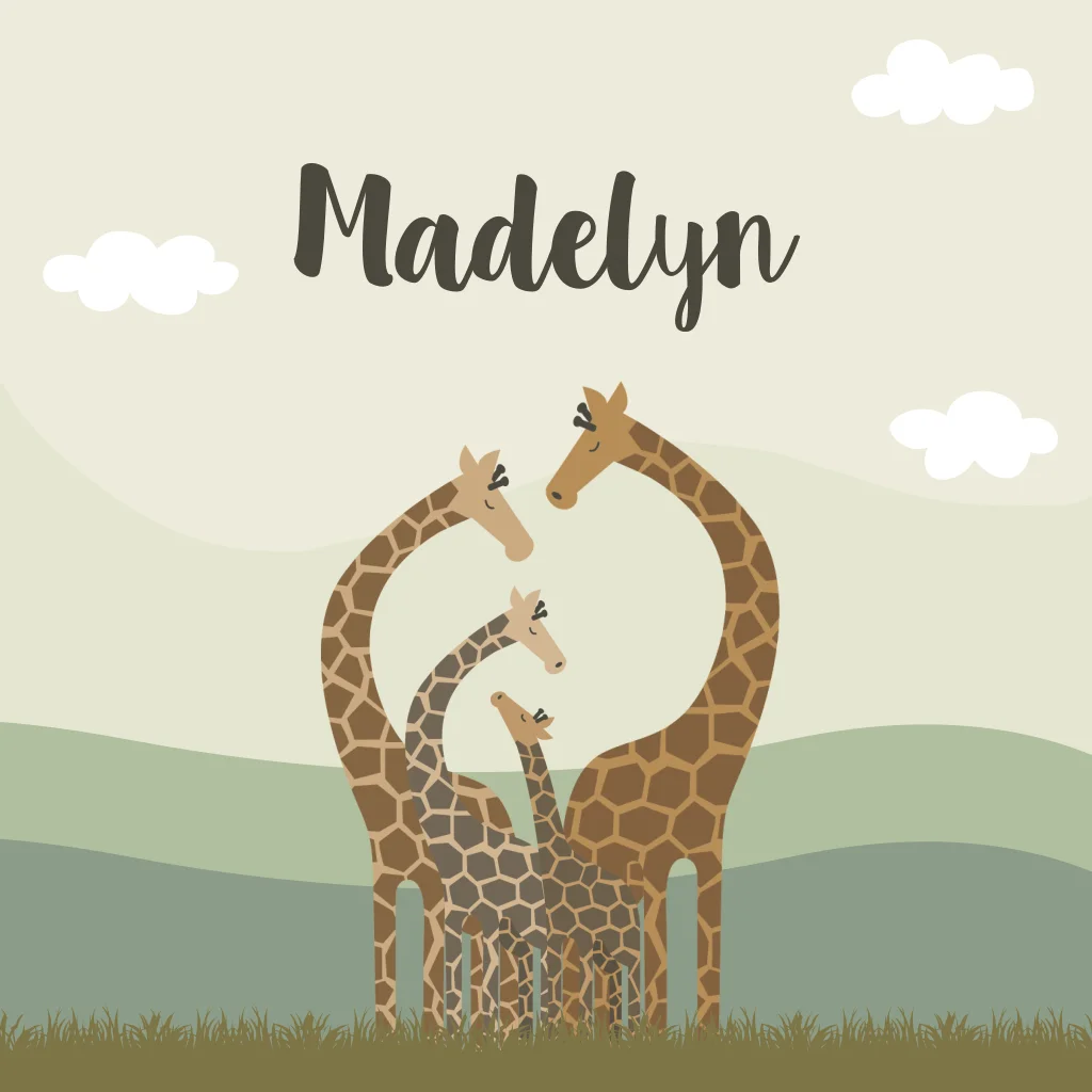 Een stoer, maar ook lief geboortekaartje met een familie van giraffen op de voorkant. Kaartje Madelyn is geheel naar wens aan te passen zodat het matcht met jullie gezinssamenstelling.
