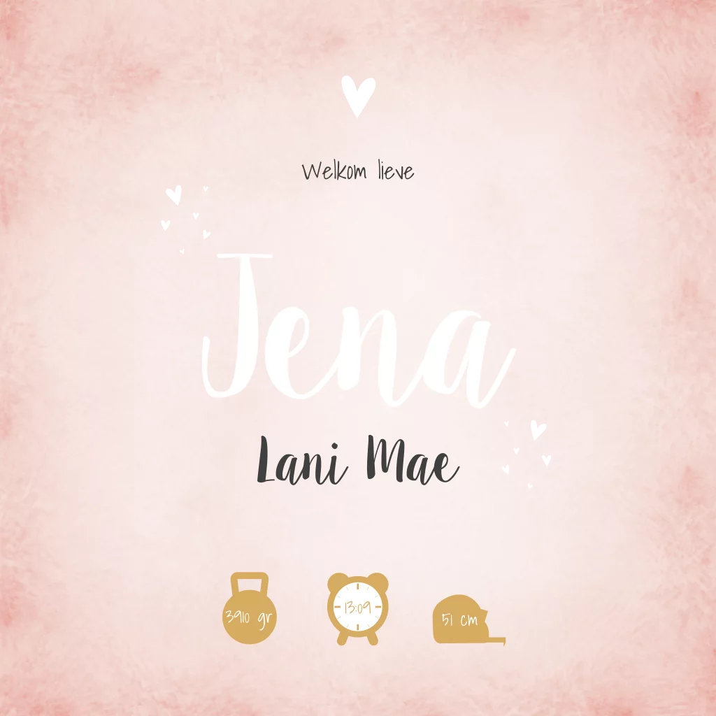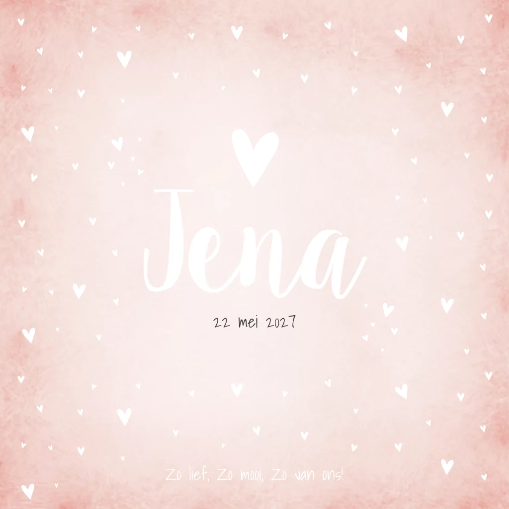Roze gewolkt geboortekaartje met hartjes. Geboortekaartje Jena is een lief en romantisch geboortekaartje voor een meisje. Maak het helemaal af met goudfolie voor de hartjes.