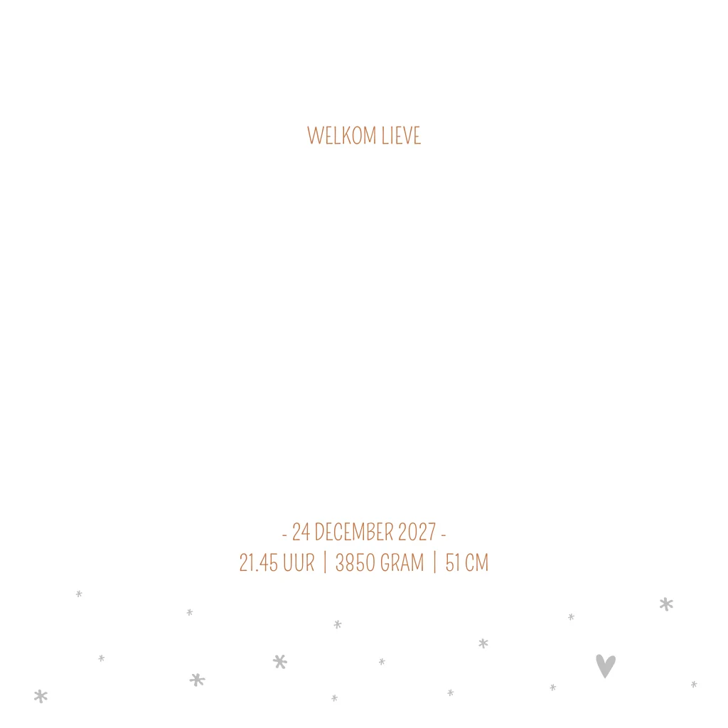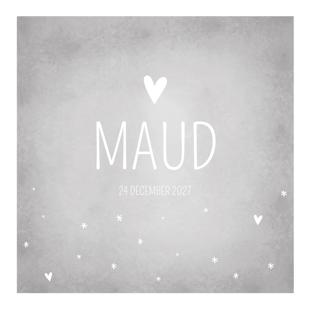 Rustig grijs gewolkt geboorte kaartje met koperen details en grijze hartjes. De kleur maakt geboortekaartje Maud een stoer kaartje. De koperen hartjes geven de kaart een lieve touch.