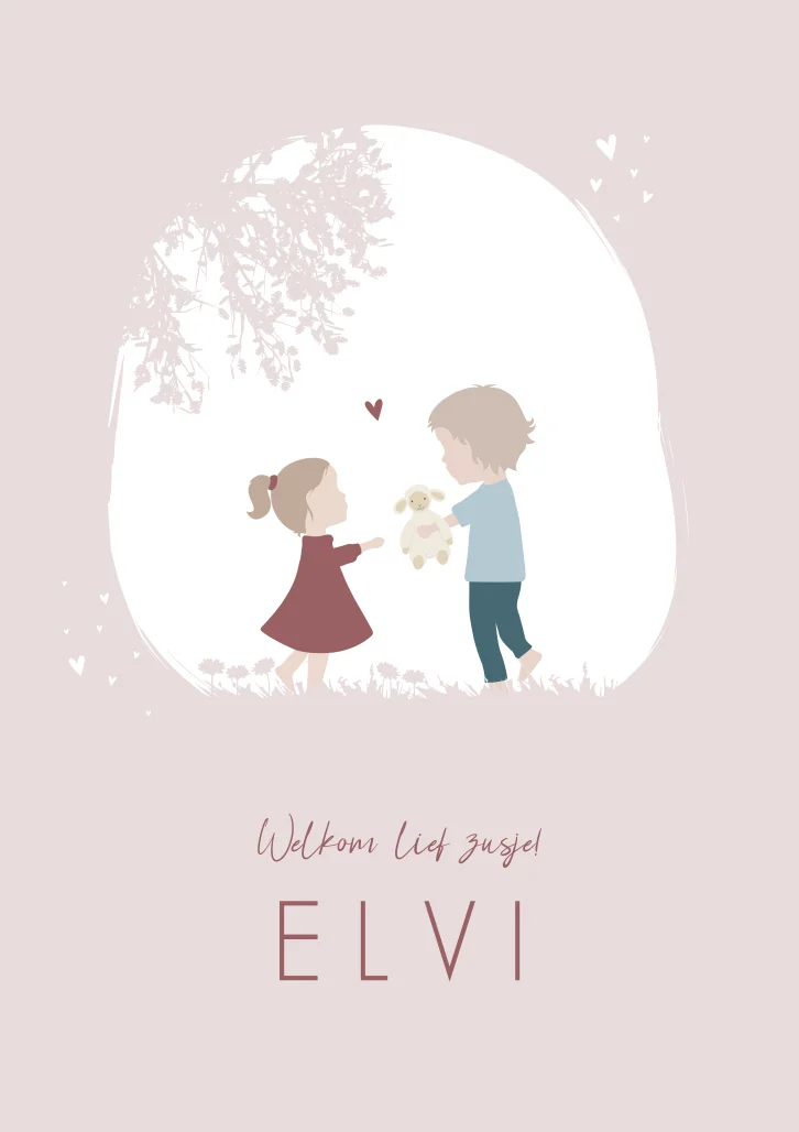 Het Uilennestje x Happy Horse. Een lief geïllustreerd geboortekaartje van een grote broer met zijn zusje met als toevoeging een Happy Horse knuffel. Wil je liever een andere knuffel of andere kindjes op de kaartje Elvi? Neem dan een kijkje in onze editor voor de vele opties!