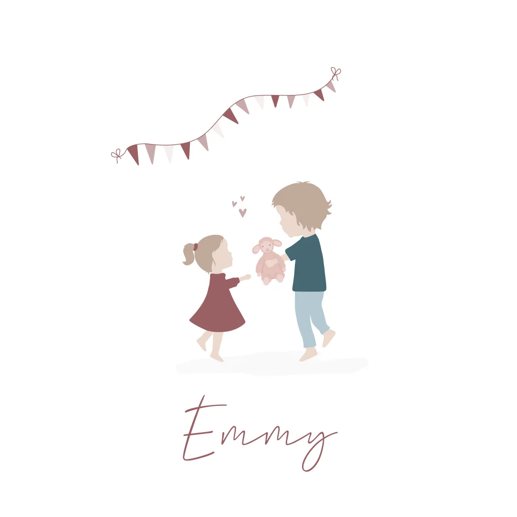 Het Uilennestje x Happy Horse. Geboortekaartje Emmy is een lief en simpel geboortekaartje met een grote broer die zijn knuffel aan zijn kleine zusje geeft. Het kaartje wordt extra feestelijk door de slingers! Wil je liever een andere knuffel? Neem dan een kijkje in onze beeldbank voor alle opties!